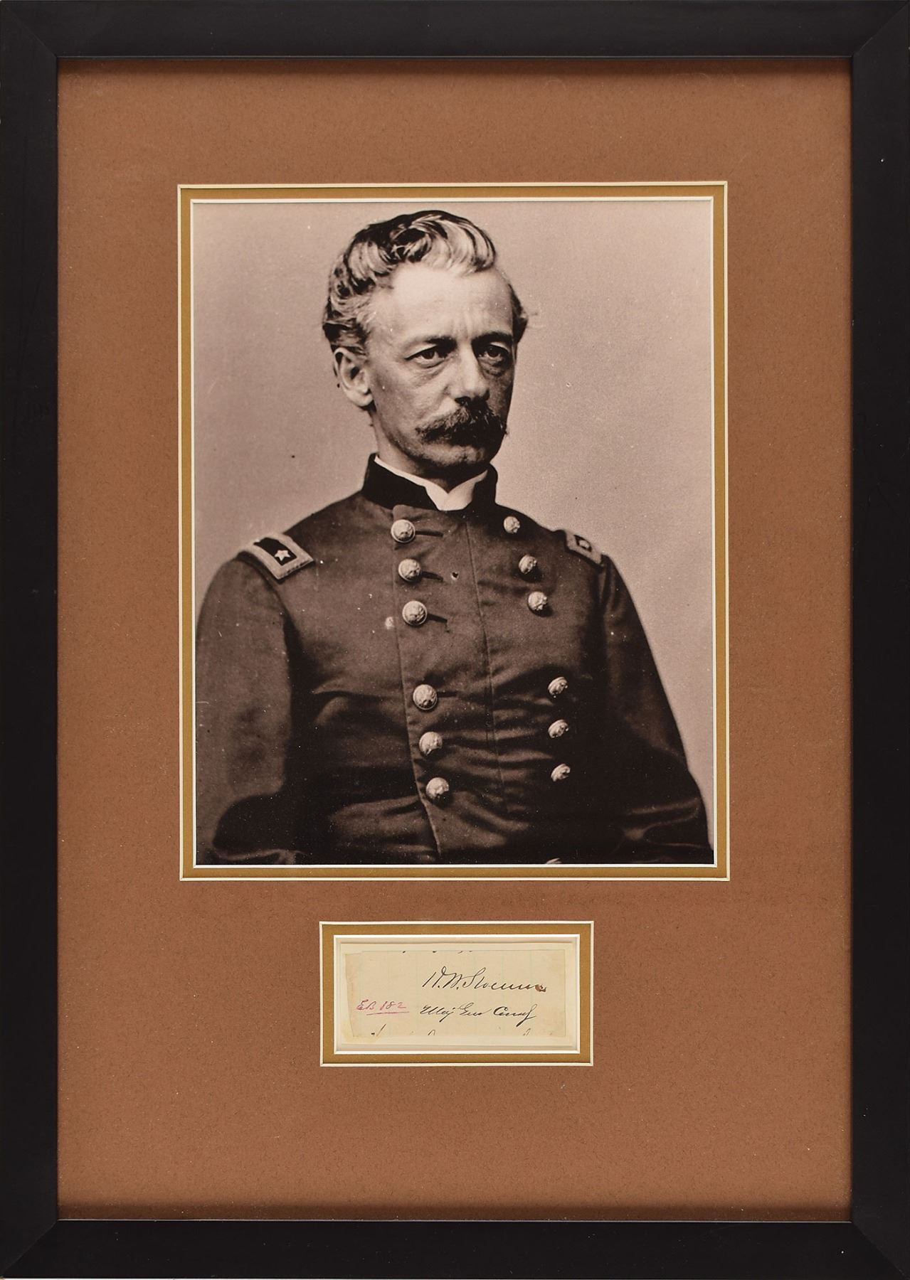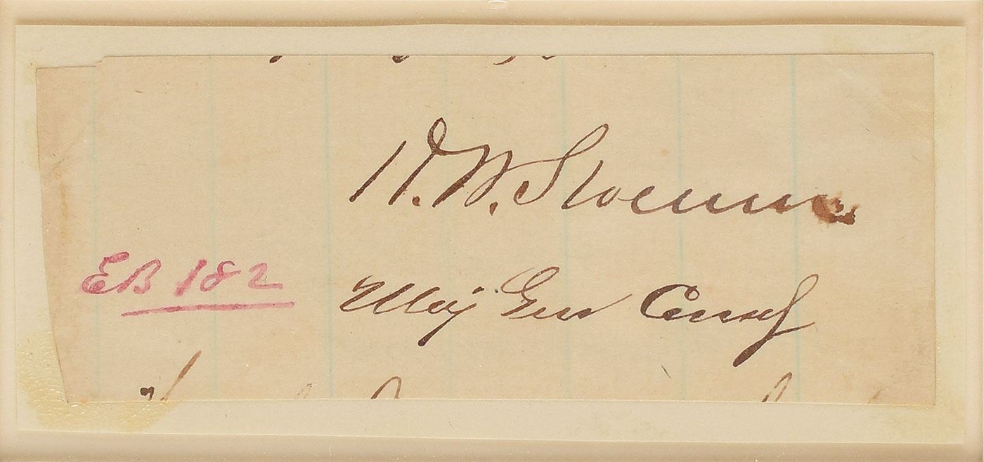 Ink signature, "H. W. Slocum, Maj. Gen. Com'g,” on an off-white 3 x 1 slip. Double-matted and framed with a portrait to an overall size of 12.25 x 17.25. In fine condition.