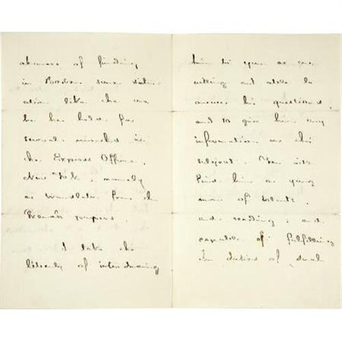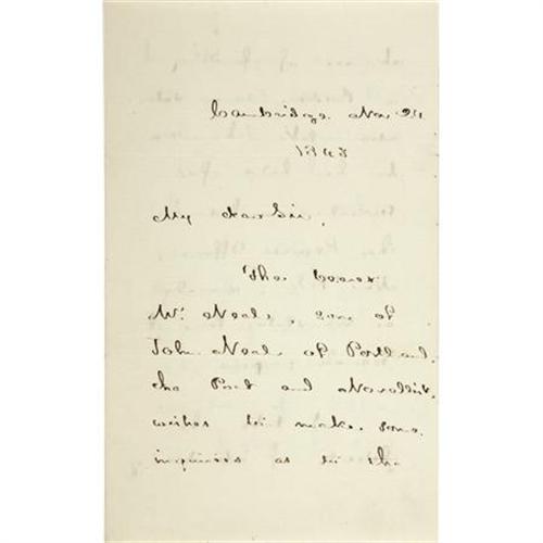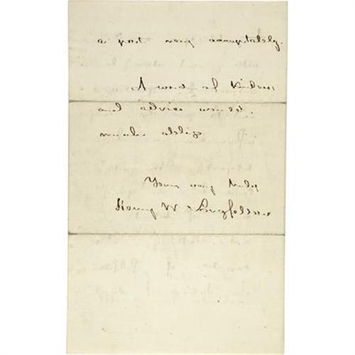 <B>Henry Wadsworth Longfellow Autograph Letter Signed</B></I> "<I>Henry W. Longfellow</B></I>". Four pages, 4.5" x 7.25", Cambridge [Massachusetts], November 24, 1848, with the usual fold creases, minor splits at the edges of the fold, else very good. A letter of introduction for the son of poet and novelist John Neal. Longfellow writes in full: "<I>The bearer W. Neal, son of John Neal, of Portland [Maine] the poet and novellist [sic], wishes to make some inquiries as to the chances of finding in Boston some situation like the one he has held for several months in the Express Office, New York, namely as translator from the French papers. I take the liberty of introducing him to you as one willing and able to answer his questions and to give him any information on this subject. You will find him a young man of talent and reading; and, capable of fulfilling the duties of such a post very acceptably. A word of kindness and advice would much oblige. Yours very truly, Henry W. Longfellow</B></I>". <BR><BR><BR><b>Shipping:</b> Flat Material, Small (<a target="_blank" href="http://www.heritageauctions.com/common/shipping.php">view shipping information</a>)