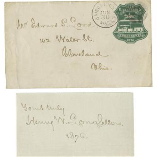 <B>Henry Wadsworth Longfellow Signature</B></I> “<I>Yours truly Henry W. Longfellow. 1876</B></I>”. 4.25” x 2.5”, with the original transmittal envelope with a Cambridge, Massachusetts postmark. A beautiful, large signature of America’s preeminent poet in fine condition. The envelope shows typical posting wear, else very good.<BR><BR><BR><b>Shipping:</b> Flat Material, Small (<a target="_blank" href="http://www.heritageauctions.com/common/shipping.php">view shipping information</a>)