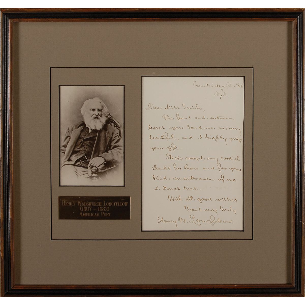 ALS signed “Henry W. Longfellow,” one page, 4.25 x 6.5, December 26, 1878. Longfellow writes, in full: “The ferns and autumn leaves you send me are very beautiful, and I highly prize your gift. Please accept my cordial thanks for them and for your kind remembrance of me at Xmas time.” Matted and framed, with a photo of Longfellow and a commemorative plaque, to an overall size of 13 x 12.5. In fine condition, with a bit of mild toning.