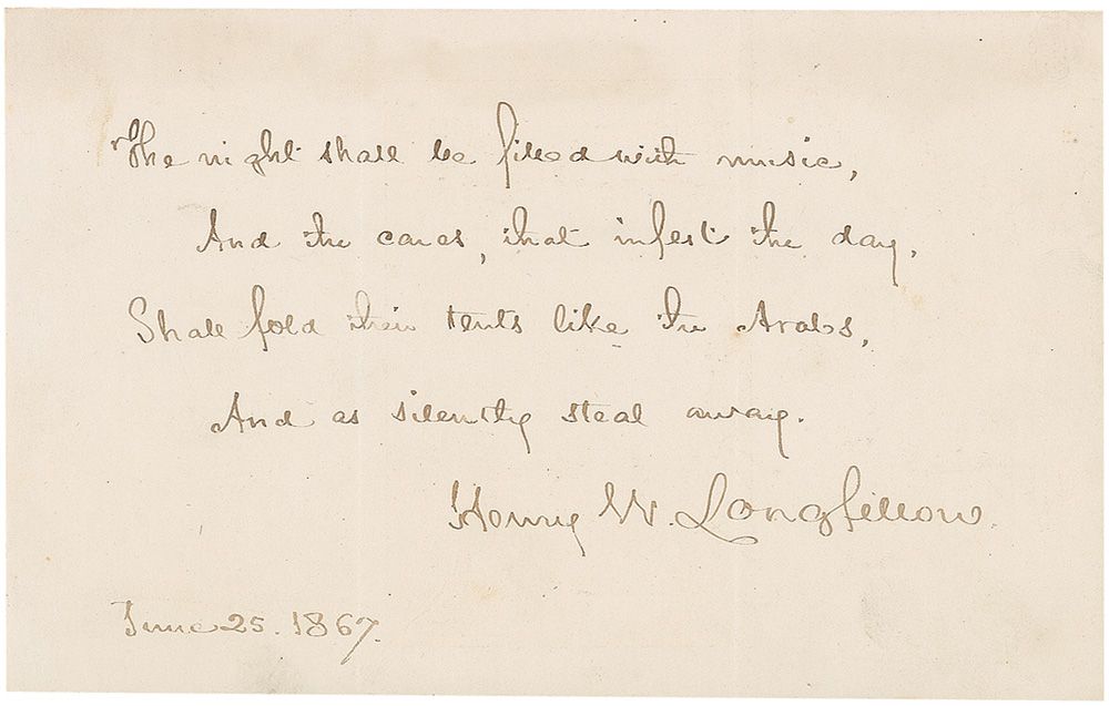 AQS, signed “Henry W. Longfellow,” on a 7 x 4.5 off-white sheet, dated June 25, 1867. Longfellow pens the famous closing stanza from his beloved ‘The Day Is Done.’ In full: “And the night shall be filled with music,/ And the cares, that infest the day,/ Shall fold their tents, like the Arabs,/ And as silently steal away.” Sheet is affixed to a slightly larger card. In fine condition, with two vertical folds, one through a single letter of signature, and some scattered light toning.