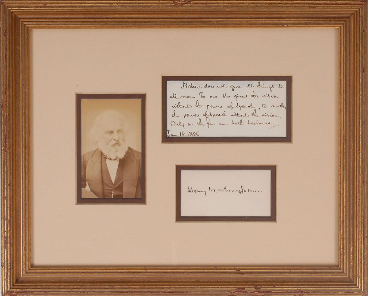 Nicely penned autograph quote, unsigned, 4.75 x 2, January 16, 1866, in full: “Nature does not give all things to all men. To one She gives the vision without the power of speech, to another the power of speech without the vision. Only on the few are both bestowed”; and an ink signature, “Henry W. Longfellow,” on an off-white 3.5 x 1.75 card. Handsomely double-matted and framed with an original carte-de-visite portrait of the poet to an overall size of 14.5 x 11.75. In overall fine condition, with light show-through from mounting remnants at the top of the quote.