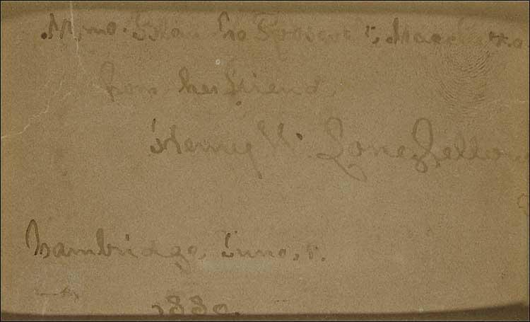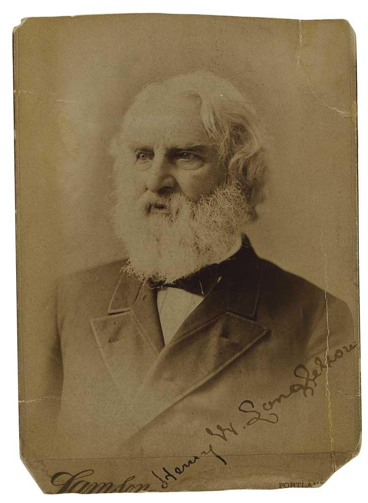 Original vintage 4.25 x 6 Samson cabinet photo, signed in black ink, “Henry W. Longfellow.” Reverse of photo bears a faded but mostly legible signature and inscription, “Mme. Blanche Roosevelt, from her friend Henry W. Longfellow, Cambridge, June 1, 1880.” Double matted and framed, with both signatures visible, to an overall size of 14.25 x 16.5. In very good condition, with trimmed top edge, clipped lower corner tips, image side bears a crack to right side, (through a single letter of signature), several creases, last name a shade light, but still legible. Pre-certified PSA/DNA and RRAuction COA.