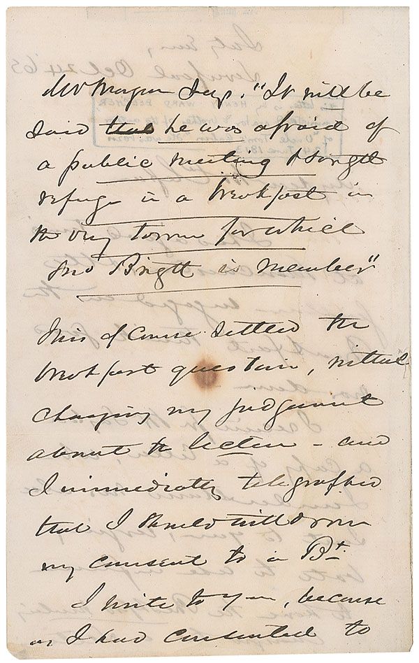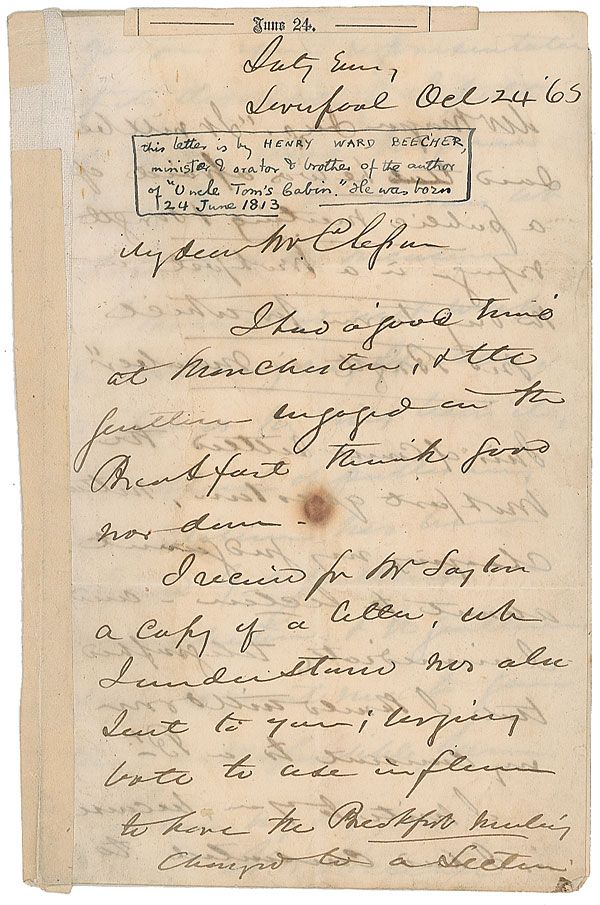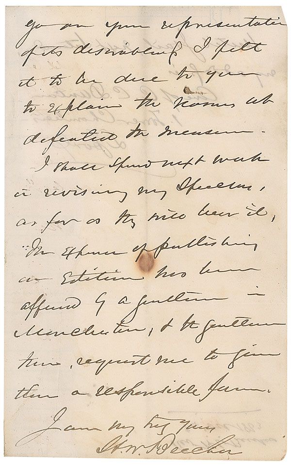 Prominent and sometimes controversial American clergyman, orator, and abolitionist (1813–1887) who was the brother of Uncle Tom’s Cabin author Harriet Beecher Stowe. ALS signed “H. W. Beecher,” four pages on two adjoining sheets, 5.25 x 8, October 24, 1863. Letter to a gentleman. In part: “I received fr Mr. Layton a copy of a letter…urging both to use influence to have the Breakfast Meeting changed to a Lecture. Mr. Morgan say ‘It will be said that he was afraid of a public meeting & sought refuge in a Breakfast in the very town for which Jno. Bright is a member.’” Intersecting folds, a central spot of staining, mounting remnants and repairs at adjoining fold, and ink notations and affixed date to top of first page, otherwise very good condition.