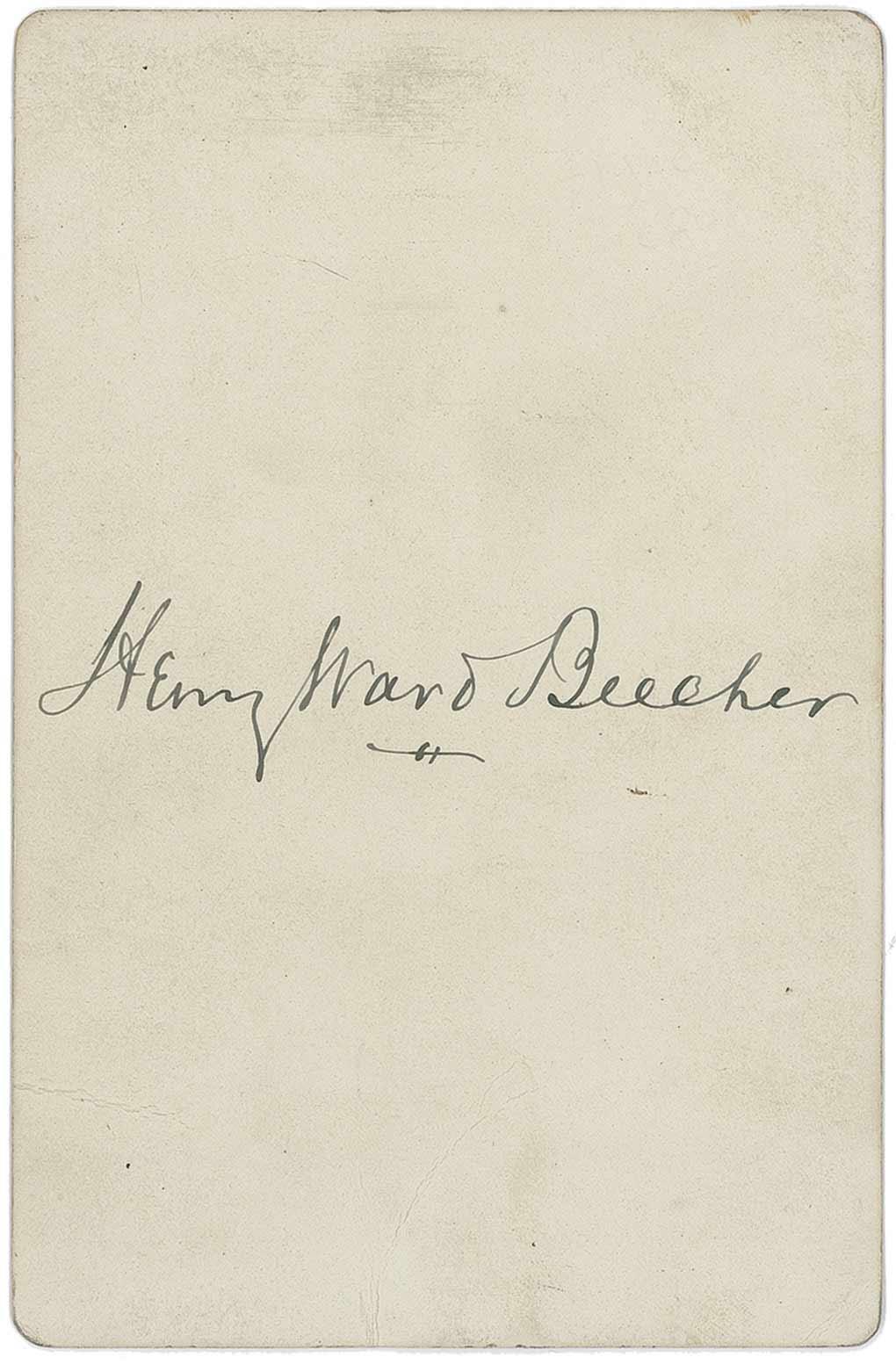Prominent and sometimes controversial American clergyman, orator, and abolitionist (1813–1887) who was the brother of Uncle Tom’s Cabin author Harriet Beecher Stowe. Original vintage 4.25 x 6.5 Sarony cabinet photo of Beecher in a suit and overcoat, signed on the reverse in ink, “Henry Ward Beecher.” In very good to fine condition, with some light silvering, creasing to lower portion of image, and some scattered light soiling to reverse.
