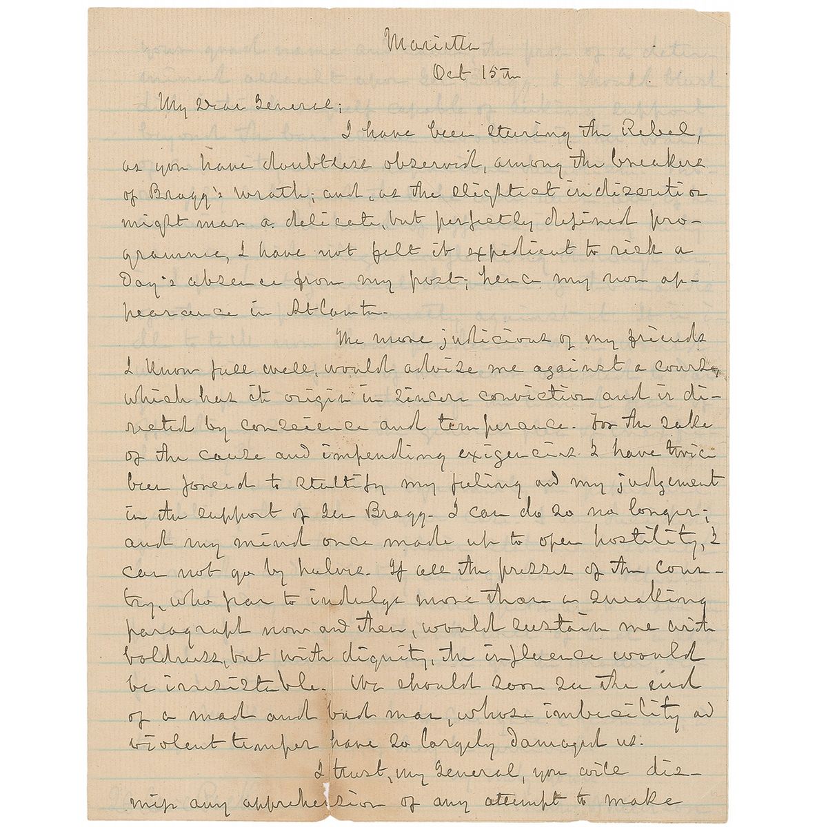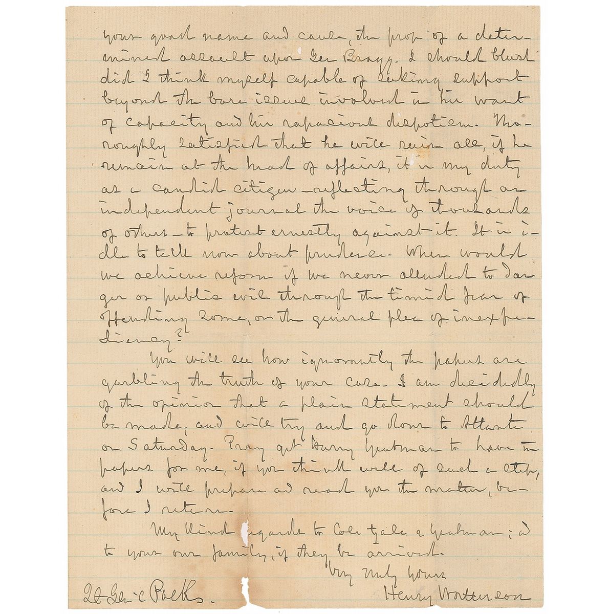 Confederate officer and journalist (1840–1921) who served under Nathan Bedford Forrest. War-dated ALS, two pages on two adjoining sheets, 7.25 x 9.25, October 15, [1863]. Letter to General Leonidas Polk. In part: "I have been steering the Rebel, as you have doubtless observed, among the breakers of Bragg's wrath; and as the slightest indiscretion might mar a delicate, but perfectly defined programme, I have not felt it expedient to risk a day's absence from my post; hence my non appearance at St. Canton…I have twice forced to stultify my feeling and my judgment in the support of Gen. Bragg, I can do so no longer; and my mind once made up to open hostility, I can not go by halves. If all the presses of the country who fear to indulge more than a quaking paragraph now and then, would sustain me with boldness, but with dignity, the influence would be irresistible. We should soon see the end of a mad and bad man, whose imbecility and violent temper have so largely damaged us. I trust, my general, you will dismiss any apprehension of any attempt to make your good name and cause, the prop of a determined assault upon Gen. Bragg. I should blush did I think myself capable of seeking support beyond the bare issue involved in his want of capacity and his rapacious despotism." In very good condition, with intersecting folds with some small edge separations and paper loss at the lower left (affecting a few words), and a few other specks of paper loss throughout the second page.