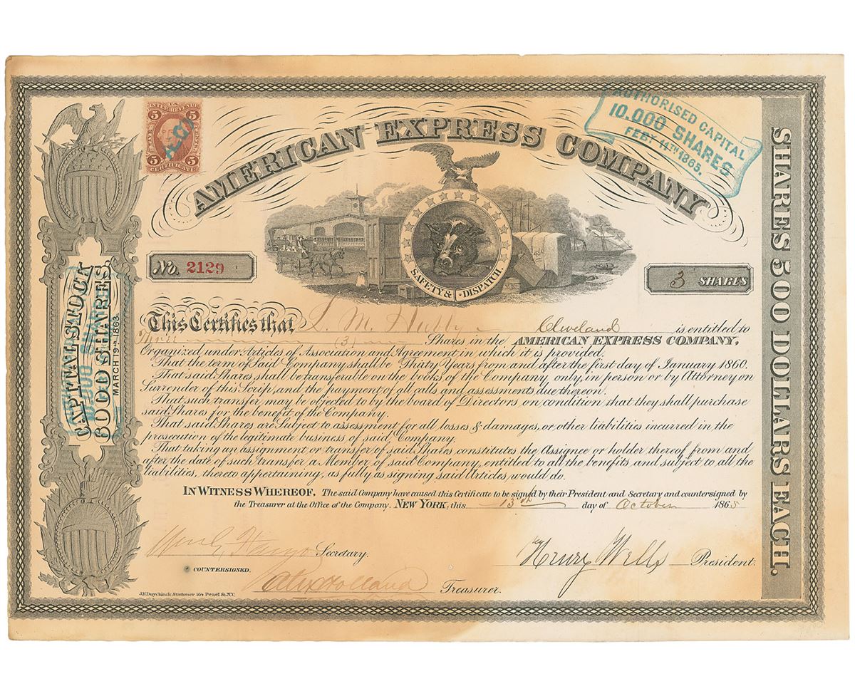 Partly-printed DS, signed “Henry Wells” and “Wm. G. Fargo,” one page, 12.25 x 8.5, October 13, 1865. Handsomely engraved certificate for three shares of capital stock in the American Express Company, issued to L. M. Hubby of Cleveland, signed at the conclusion by Wells as president and Fargo as secretary. In very good condition, with expected document wear and dampstaining to a large portion of the document (not affecting legibility).