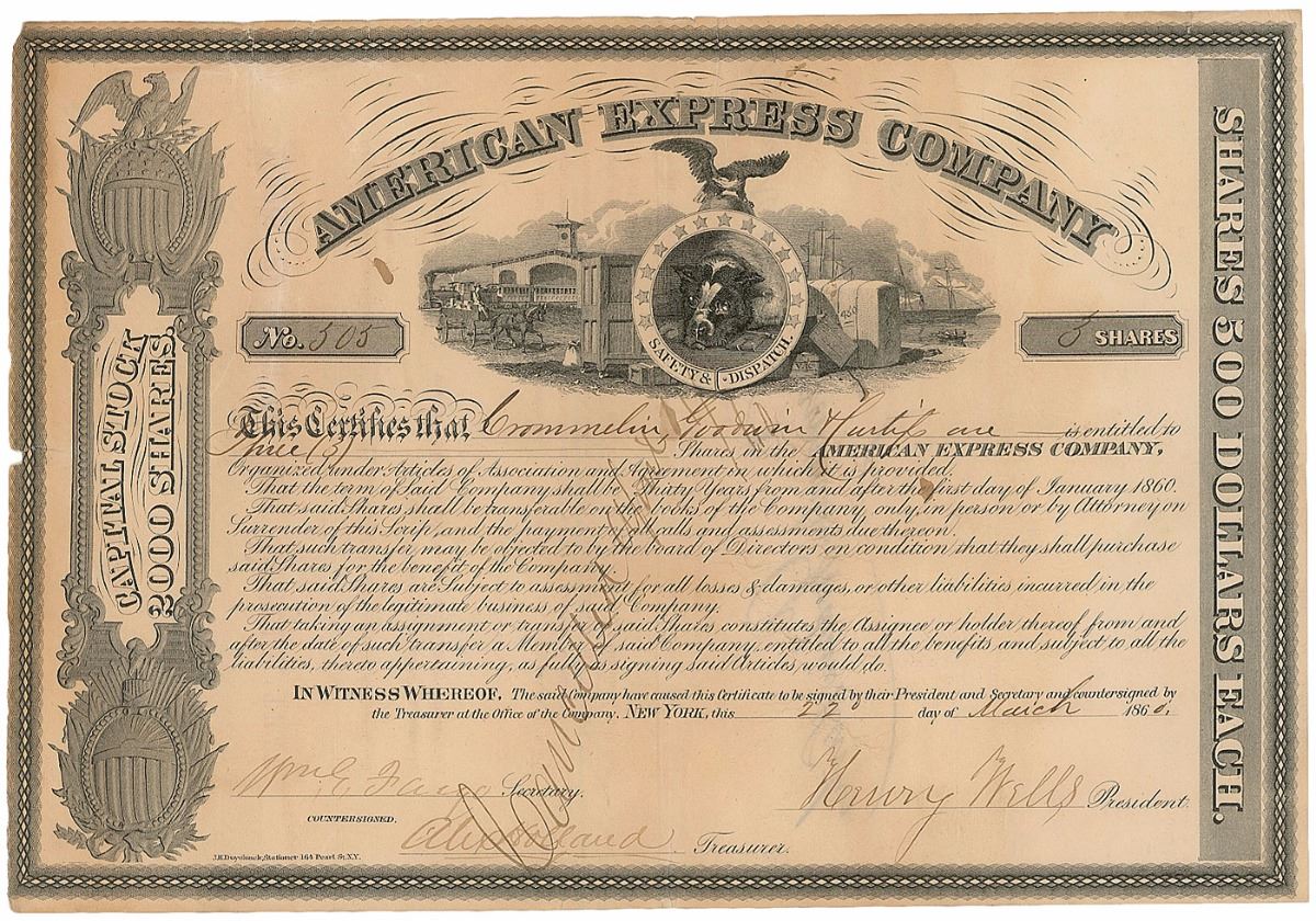 Partly-printed DS, signed “Henry Wells” and “Wm. G. Fargo,” one page, 11.5 x 8, March 22, 1860. Handsomely engraved certificate for three shares of capital stock in the American Express Company issued to Crommelin, Goodwin & Curtis. Signed at the conclusion by Wells as president and Fargo as secretary. Expected document wear, light overall toning and wrinkling, a few small edge tears, and a few stray ink marks, otherwise fine condition.