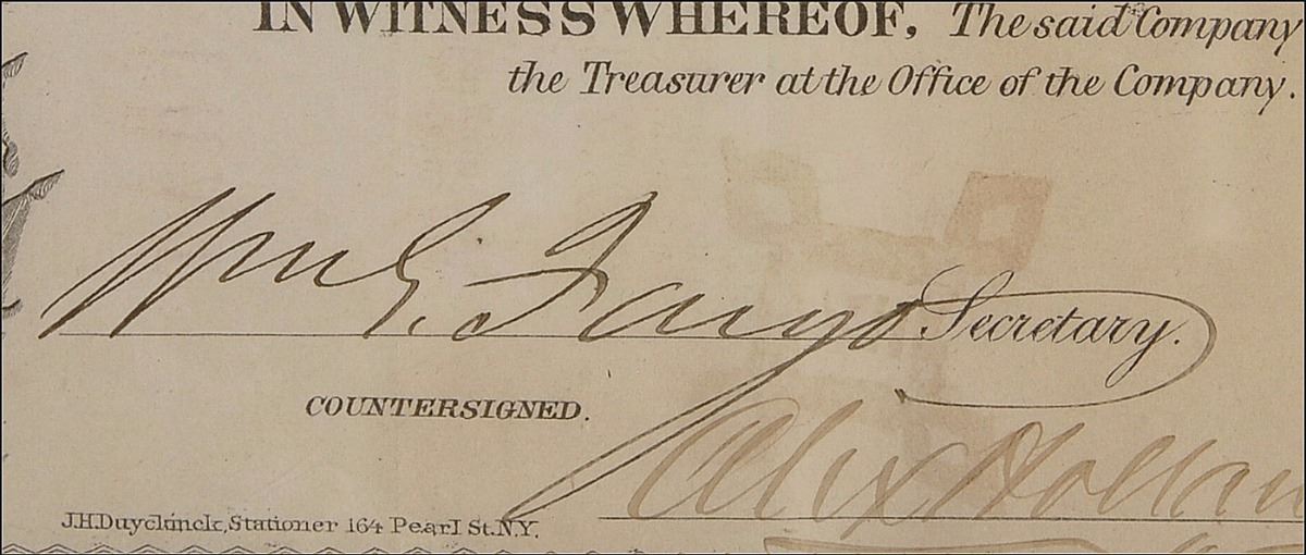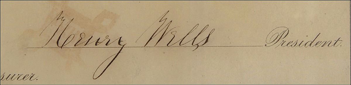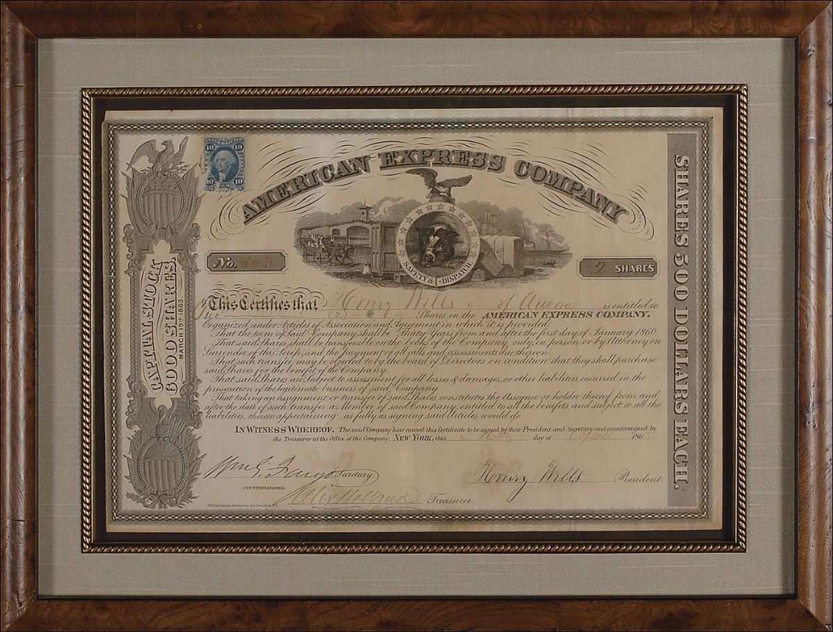 Partly-printed DS, one page, 11.75 x 8, April 16, 1863. American Express Company certificate issuing to Henry Wells of Aurora two shares of capital stock. Signed at the conclusion by Wells as president, “Henry Wells,” and countersigned by Fargo as secretary, “Wm. G. Fargo.” Wells has signed again on the reverse. Nicely cloth-matted and framed with a viewing window on the reverse. In very good to fine condition, with scattered light, somewhat irregular toning.