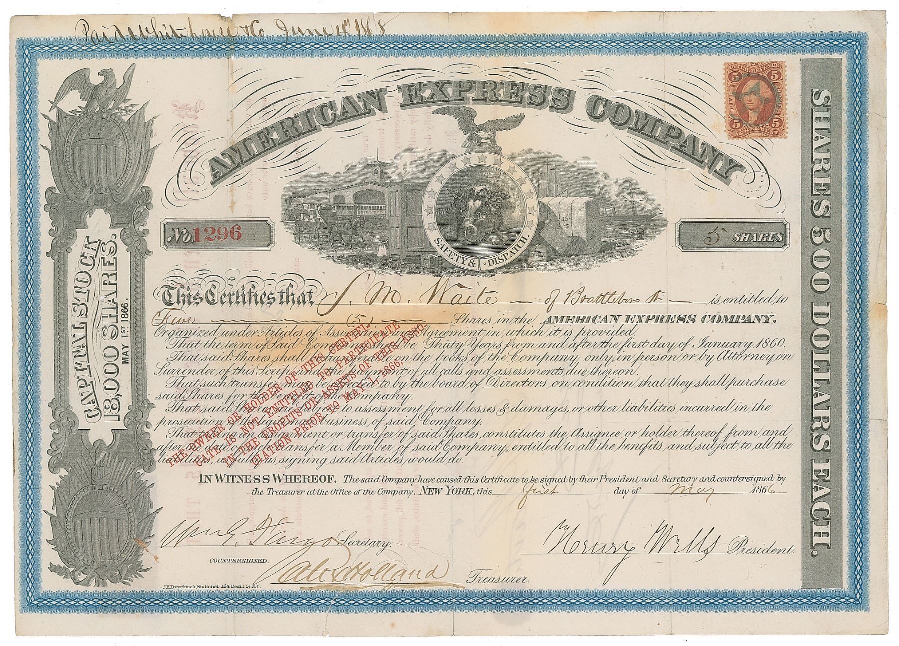 Partly-printed DS, signed “Henry Wells" and "Wm. G. Fargo,” one page, 12 x 8.5, May 1, 1866. Handsomely engraved stock certificate for five shares in the American Express Company, issued to L. M. Waite. Signed at the conclusion by Henry Wells as president, William Fargo as secretary, and Alex Holland as treasurer. In very good to fine condition, with an area of light toning, and several unobtrusive cancellation cuts to the bottom, two of which touch Wells's signature.