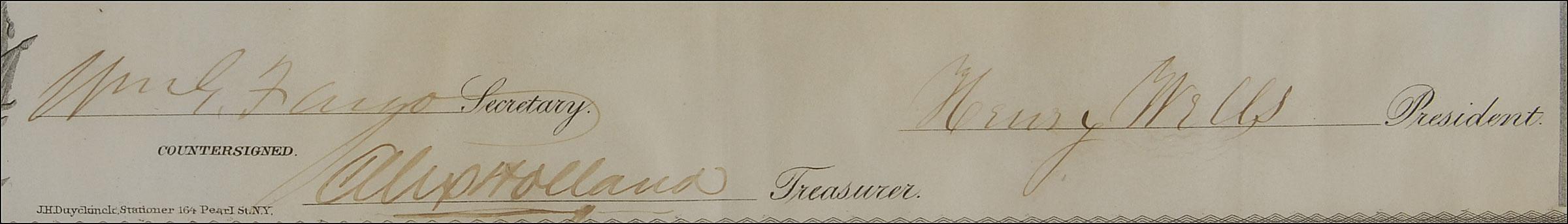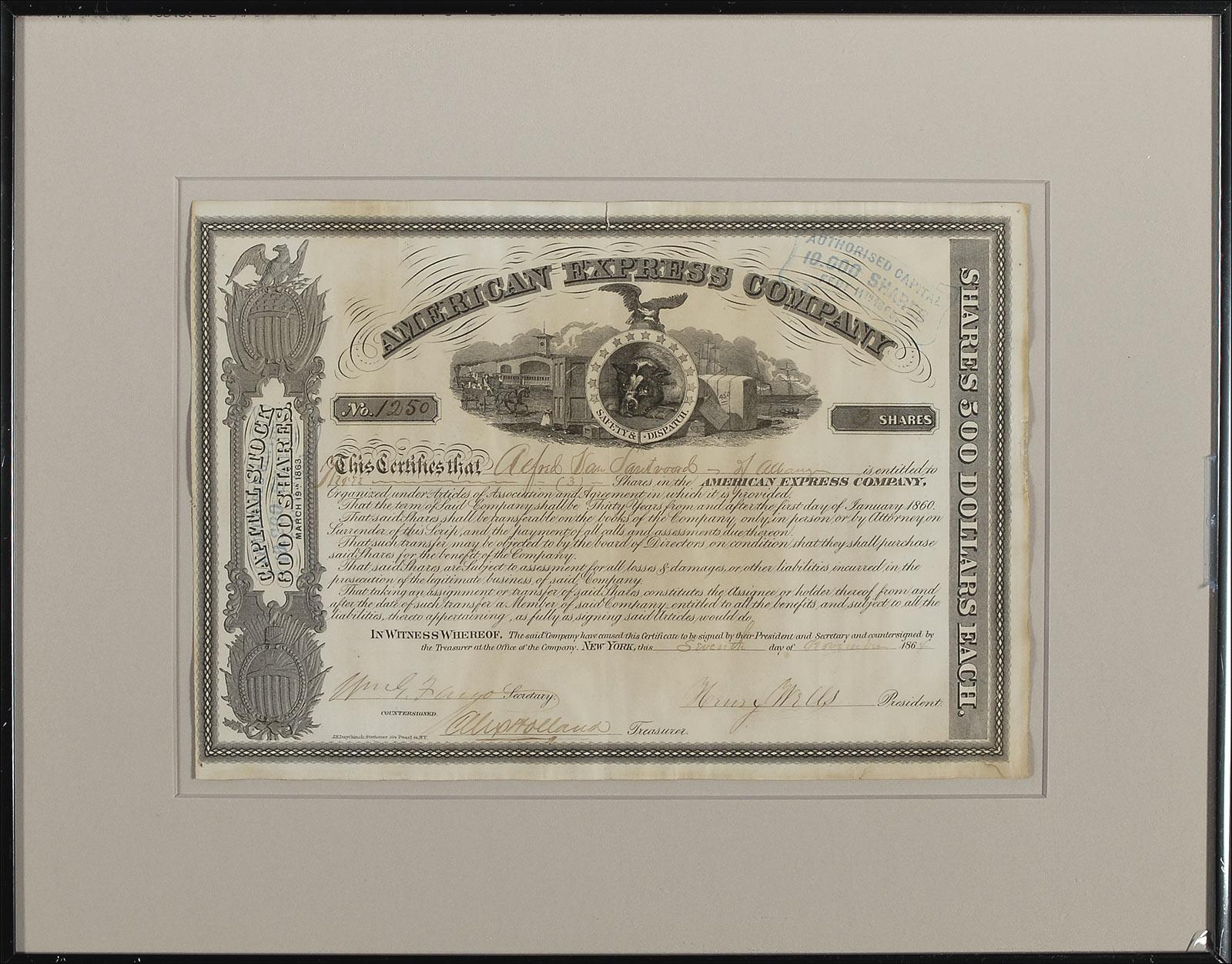 Businessmen Henry Wells (1805–1878) and William Fargo (1818–1881) founded the American Express Company in 1850 and the Wells Fargo Company in 1851. By capitalizing on the burgeoning need for express and banking services, both men (and their companies) came to number among the greatest success stories in the commercial development of the American west—and, indeed, became still-familiar household words. Partly printed DS, one page, 12 x 8.25, November 7, 1864. A handsomely engraved certificate for three shares of capital stock in the American Express Company, issued to Alfred Van Saritvoord of Albany, signed “Henry Wells” as President and “Wm. G. Fargo” as Secretary. Matted and framed to an overall size of 17.75 x 14. In very good condition, with three vertical folds, scattered toning, mild rippling to edges, and two stamps to edges. Pre-certified PSA/DNA and RRAuction COA.