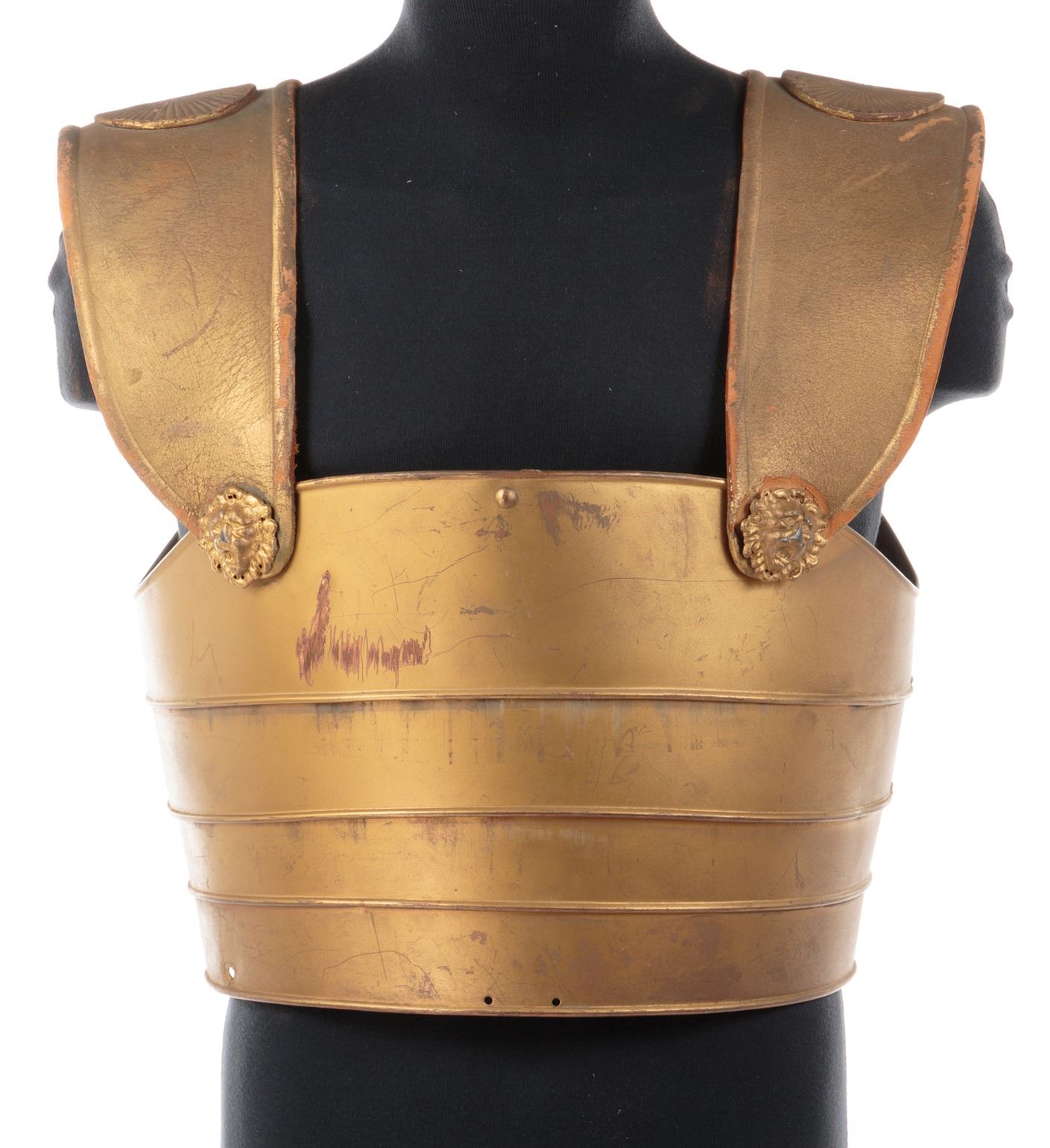 131. Henry Wilcoxon Ahtur arm cuff, (2) Philistine Soldier cuirasses and shield from Samson and Delilah. (Paramount, 1949) Vintage original (2) golden cuirasses constructed from gold gilt copper with hinged wide leather straps, 1-retaining lion head ornamentation, and both with chain hook and eye back closure, (1) round gold gilt metal shield with 3D sunburst on face and riveted leather straps on back, and (1) gold gilt metal lion cuff with leather accents and interior elastic arm band. Exhibiting age and production wear, some cracking to leather, some marring and rubbing of the gold gilt. Overall in vintage good to very good condition. $400 - $600