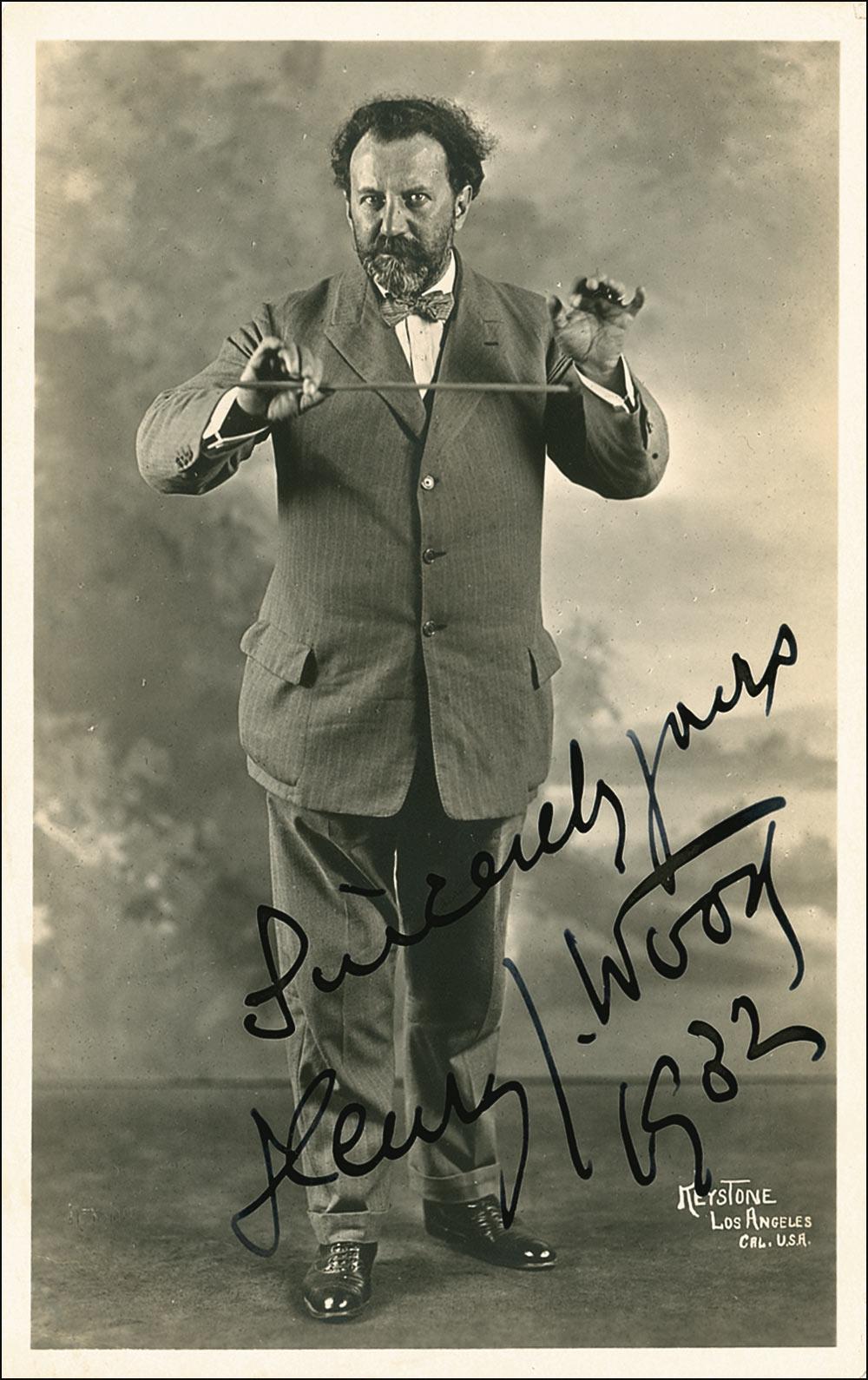 English conductor (1869-1944), forever associated with The Proms which he conducted for half a century. Vintage matte-finish 3.5 x 5.5 postcard photo of Wood in a conducting stance, signed in fountain pen, “Sincerely yours, Henry J. Wood, 1932.” In fine condition, with mild edge wear and a faint corner bend. RRAuction COA.