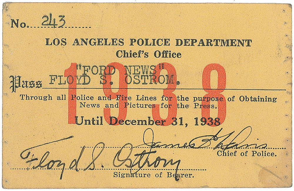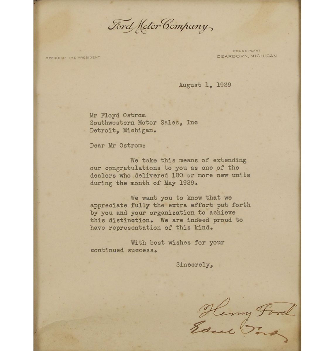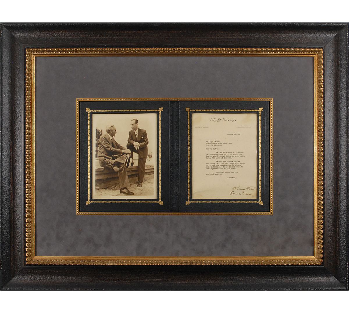 Uncommon TLS, one page, 6 x 8, Ford Motor Company letterhead, August 1, 1939. Letter congratulating dealer Floyd Ostrom for reaching an impressive goal. In full: “We take this means of extending our congratulations to you as one of the dealers who delivered 100 or more new units during the month of May 1939. We want you to know that we appreciate fully the extra effort put forth by you and your organization to achieve this distinction. We are indeed proud to have representation of this kind.” Letter is in a 8.25 x 10.5 leather display frame, with a portrait of the Fords on the opposite side. Leather display is in turn suede-matted and framed to an overall size of 32 x 25. In very good condition, with uniform toning, scattered light foxing and a crease to left edge. Accompanied by Ostrom’s 1938 Los Angeles Police Department press pass. Just the third item signed by both Fords we have offered, this one with exceedingly desirable automotive content. Oversized.