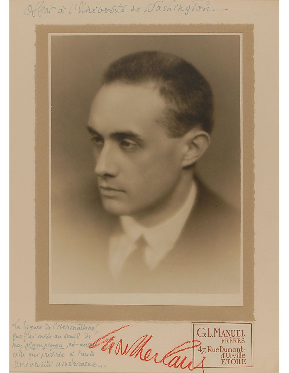 French essayist and novelist (1895–1972) considered one of the leading French dramatists of the twentieth century. Vintage matte-finish 7.75 x 11 photo by G.L. Manuel Freres, affixed to its original 8.5 x 12 mount, boldly signed in red artist’s pencil, an