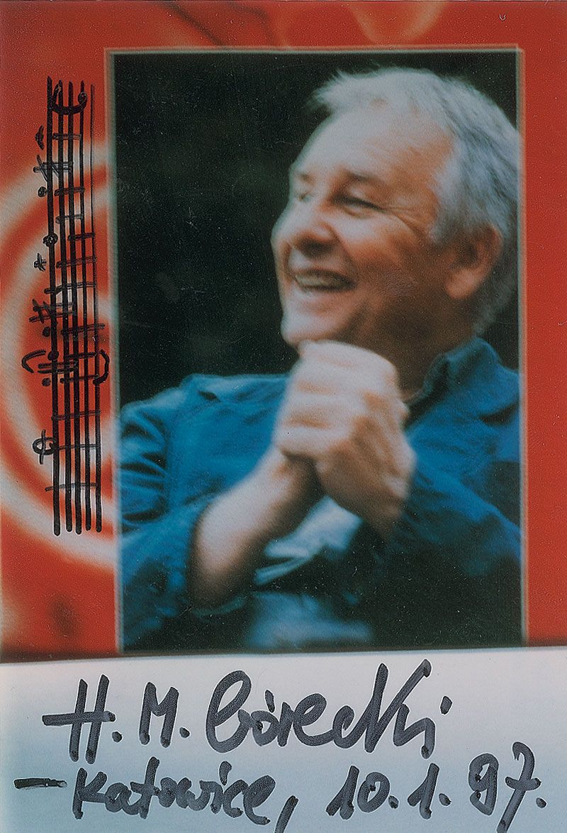 Polish composer of classical music (1933–2010). Color satin-finish 4 x 6 photo, signed in the lower border in black felt tip, “H. M. Gorecki, Katowice, 10.1.97,” with a three-bar AMQS added along the left edge. In very fine condition.