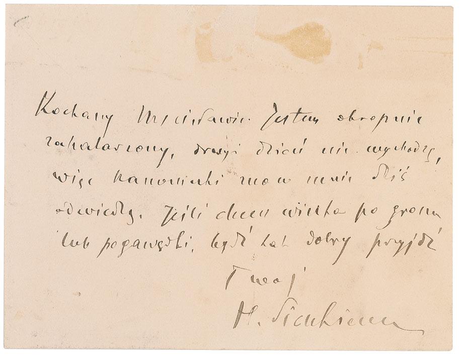 Novelist who received the Nobel Prize for Literature in 1905. Rare ALS in Polish, signed “H. Sienkiewicz,” one page, 4.5 x 3.5, no date. Letter to to painter Ladislaus Czackorski in which Sienkiewicz writes that he is not feeling well and cannot leave his home and asks his friend to bring some wine and food and come to meet him in his house. Uniform toning, scattered light soiling, and surface loss and adhesive remnant to top, otherwise fine condition.