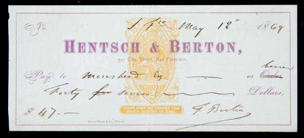 Hentsh & Berton Check. Hentsch & Berton were the successors in 1863 to Henry Hentsch's banking and assay business in San Francisco. Hensch was born in Geneva about 1830 and arrived in California in 1849 after working in Grass Valley and Sonoma. He opened an assay office and bank in San Francisco about 1856, though he may have been active in banking there as early as 1854. Hensch is is perhaps best known to numismatists by the rare Hentsch gold nuggets found at the wreck site of the S.S. Central America which sank in 1857. Ephemera from Hensch is even more rare than the ingots. The most common collectables are Hentsch & Berton checks, though there are probably less than ten known, this being one of them.