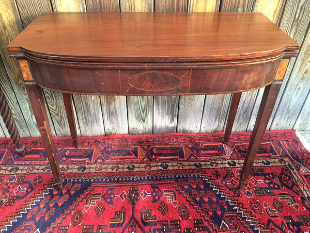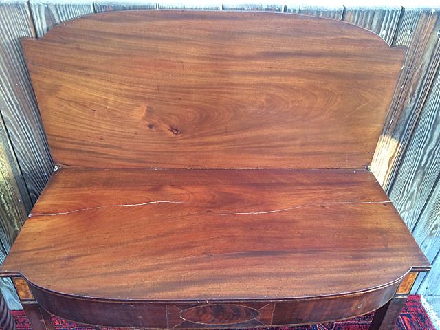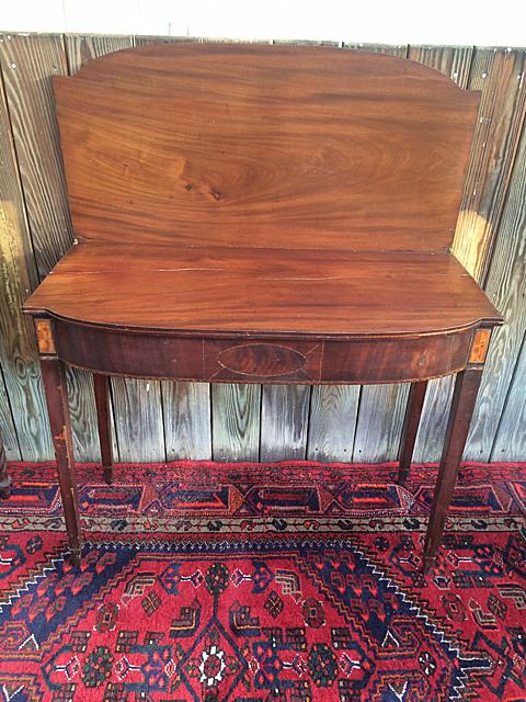 Hepplewhite lift top game table, mahogany, from South Shore, Boston, Mass. area cabinet maker, with banded inlay, all original finish.