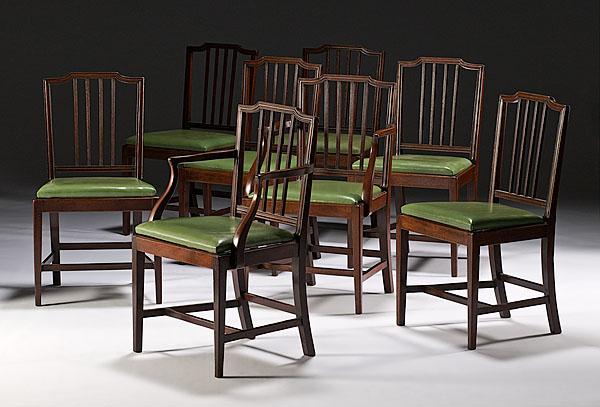 American, early 20th century. Set of eight including six sides and two arm chairs. Each mahogany, with a brand on the rear stretcher, 235. The molded straight sides with pillow crestrails and four reeded splats, the slip seats over tapering legs; 35.25" overall height, 17.5" seat height.