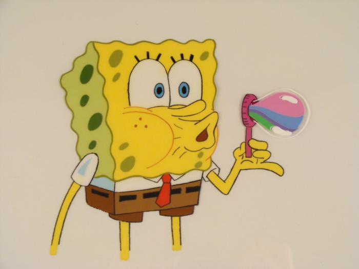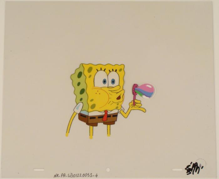 To create production cels, the original animator's drawing is transferred onto an acetate cel (by hand-inking and/or photo copying). The cel is then hand-painted on the reverse side. The cel is ready to be matted and framed. The animator's notations are at the bottom of the cel. The cel is multilayered: first is the bubbles outline, next is the colorful bubble filler, and then is Spongebob blowing the bubble.