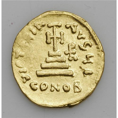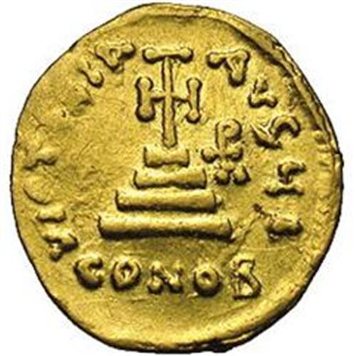 <B>Heraclius, with Heraclius Constantine and Heraclonas.</B></I> A.D. 610-641. AV solidus (20 mm, 4.20 g). Constantinople, ca. A.D. 632-635. Heraclius standing facing, holding globus cruciger, flanked by his sons Heraclius Constantine and Heraclonas; Heraclius Constantine crowned, cross in left field above head of Heraclonas / Cross potent on three steps; monogram in right field; I/CONOB. DOC 33g; SB 758. Fine, clipped.