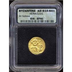 <TABLE cellSpacing=0 cellPadding=0 width="100%" bgColor=#000000 border=0><TBODY> <TR><TD width="100%"><TABLE cellSpacing=1 cellPadding=3 width="100%" border=0><TBODY><TR><TD width="100%" bgColor=#79735c><FONT face=arial color=#ffffff size=3><B>Description</B> </FONT></TD></TR><TR><TD width="100%" bgColor=#ffffff><FONT face=arial size=2><B>Heraclius.</B></I> A.D. 610-641. AV solidus (20 mm). Constantinople, ca. A.D. 616-ca. 625. Crowned facing busts of Heraclius on left and Heraclius Constantine on right; cross between their heads / Cross potent on three steps; E/CONOB. DOC II 13d; SB 738. XF40 ICG. </FONT></TD></TR></TBODY></TABLE></TD></TR></TBODY></TABLE><BR><A name=PricesRealized></A><TABLE cellSpacing=0 cellPadding=0 width="100%" bgColor=#000000 border=0><TBODY><TR><TD width="100%"><TABLE cellSpacing=1 cellPadding=3 width="100%" border=0><TBODY><TR><TD width="100%" bgColor=#79735c><A name=PR><FONT face=arial color=#ffffff size=3><B>Previous Prices from Heritage Auctions</B> </FONT></A></TD></TR><TR><TD bgColor=#f6f6ed>No Prior Data Recorded </TD></TR><TR><TD bgColor=#ffffff><FONT face=arial size=1 ?>PLEASE NOTE: All prices realized reflect the final hammer price PLUS the buyer's premium in auctions that charge a buyer's premium. Each item has a notation at the top of the listing indicating whether that lot included a buyer's premium. Example: A item that sells with a final hammer price of $100 and a 20% buyer's premium will display with a price realized of $120. All information listed is intended to be as accurate as possible, but errors are possible. Please use this guide carefully and inform us of any inaccuracies. </FONT></TD></TR></TBODY></TABLE></TD></TR></TBODY></TABLE><BR><TABLE cellSpacing=0 cellPadding=0 width="100%" bgColor=#000000 border=0><TBODY><TR><TD width="100%"><TABLE cellSpacing=1 cellPadding=3 width="100%" border=0><TBODY><TR><TD width="100%" bgColor=#79735c colSpan=6><FONT face=arial color=#ffffff size=3><B>Price Guide*</B> </FONT></TD></TR><TR bgColor=#f6f6ed><TD align=middle><B>Grade</B> </TD><TD align=middle><B>Coin World<BR>(Trends)</B> </TD><TD align=middle><B>Numismedia<BR>Retail</B> </TD><TD align=middle><B>Numismedia<BR>Wholesale</B> </TD><TD align=middle><B>Coin<BR>Universe</B> </TD><TD align=middle><B>Heritage<BR>Value Index</B> </TD></TR><TR bgColor=#ffffff><TD colSpan=6><FONT size=1>*All information listed is intended to be as accurate as possible, but errors are possible. No item may be returned or refused based on this information which is provided as a service to our customers. You should contact each pricing source directly to determine the accuracy of this information. </FONT></TD></TR></TBODY></TABLE></TD></TR></TBODY></TABLE><BR><TABLE cellSpacing=0 cellPadding=0 width="100%" bgColor=#000000 border=0><TBODY><TR><TD width="100%"><TABLE cellSpacing=1 cellPadding=3 width="100%" border=0><TBODY><TR><TD width="100%" bgColor=#79735c><FONT face=arial color=#ffffff size=3><B>Population Guide</B> </FONT></TD></TR><TR bgColor=#ffffff> Important notice: Heritage usually auctions material at the rate of 200-250 lots per hour. On some occasions eBay Live bid software or the Internet may not be able to keep up with the pace of the auction. We recommend placing a realistic absentee bid now as insurance to avoid disappointment. Occasionally the auctioneer may eliminate or reject an eBay Live bid, and the auctioneer may also reopen a lot after the close of the eBay live bidding (usually because we missed an audience bid), and may reject your bid even if it shows you as the winning bidder. By bidding via eBay Live, you agree that Heritage may award the lot to another bidder at its sole discretion under the circumstances described above or any other reasonable circumstances. Also please note that all Heritage lots purchased through eBay Live carry a 20% Buyer's Premium. Please make sure you read the Terms and Conditions before you bid.</TD></TR></TBODY></TABLE></TD></TR></TBODY></TABLE>