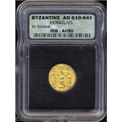 <TABLE cellSpacing=0 cellPadding=0 width="100%" bgColor=#000000 border=0><TBODY> <TR><TD width="100%"><TABLE cellSpacing=1 cellPadding=3 width="100%" border=0><TBODY><TR><TD width="100%" bgColor=#79735c><FONT face=arial color=#ffffff size=3><B>Description</B> </FONT></TD></TR><TR><TD width="100%" bgColor=#ffffff><FONT face=arial size=2><B>Heraclius.</B></I> A.D. 610-641. AV solidus (19 mm). Constantinople, A.D. 635/6(?). Heraclius in the center flanked by Heraclius Constantine on the right and Heraclonas on the left, each holding globus cruciger; cross in field above Heraclonas / Cross potent on three steps; monogram to left, I to right; B/CONOB. DOC II 34b; SB 761. AU50 ICG. </FONT></TD></TR></TBODY></TABLE></TD></TR></TBODY></TABLE><BR><A name=PricesRealized></A><TABLE cellSpacing=0 cellPadding=0 width="100%" bgColor=#000000 border=0><TBODY><TR><TD width="100%"><TABLE cellSpacing=1 cellPadding=3 width="100%" border=0><TBODY><TR><TD width="100%" bgColor=#79735c><A name=PR><FONT face=arial color=#ffffff size=3><B>Previous Prices from Heritage Auctions</B> </FONT></A></TD></TR><TR><TD bgColor=#f6f6ed>No Prior Data Recorded </TD></TR><TR><TD bgColor=#ffffff><FONT face=arial size=1 ?>PLEASE NOTE: All prices realized reflect the final hammer price PLUS the buyer's premium in auctions that charge a buyer's premium. Each item has a notation at the top of the listing indicating whether that lot included a buyer's premium. Example: A item that sells with a final hammer price of $100 and a 20% buyer's premium will display with a price realized of $120. All information listed is intended to be as accurate as possible, but errors are possible. Please use this guide carefully and inform us of any inaccuracies. </FONT></TD></TR></TBODY></TABLE></TD></TR></TBODY></TABLE><BR><TABLE cellSpacing=0 cellPadding=0 width="100%" bgColor=#000000 border=0><TBODY><TR><TD width="100%"><TABLE cellSpacing=1 cellPadding=3 width="100%" border=0><TBODY><TR><TD width="100%" bgColor=#79735c colSpan=6><FONT face=arial color=#ffffff size=3><B>Price Guide*</B> </FONT></TD></TR><TR bgColor=#f6f6ed><TD align=middle><B>Grade</B> </TD><TD align=middle><B>Coin World<BR>(Trends)</B> </TD><TD align=middle><B>Numismedia<BR>Retail</B> </TD><TD align=middle><B>Numismedia<BR>Wholesale</B> </TD><TD align=middle><B>Coin<BR>Universe</B> </TD><TD align=middle><B>Heritage<BR>Value Index</B> </TD></TR><TR bgColor=#ffffff><TD colSpan=6><FONT size=1>*All information listed is intended to be as accurate as possible, but errors are possible. No item may be returned or refused based on this information which is provided as a service to our customers. You should contact each pricing source directly to determine the accuracy of this information. </FONT></TD></TR></TBODY></TABLE></TD></TR></TBODY></TABLE><BR><TABLE cellSpacing=0 cellPadding=0 width="100%" bgColor=#000000 border=0><TBODY><TR><TD width="100%"><TABLE cellSpacing=1 cellPadding=3 width="100%" border=0><TBODY><TR><TD width="100%" bgColor=#79735c><FONT face=arial color=#ffffff size=3><B>Population Guide</B> </FONT></TD></TR><TR bgColor=#ffffff> Important notice: Heritage usually auctions material at the rate of 200-250 lots per hour. On some occasions eBay Live bid software or the Internet may not be able to keep up with the pace of the auction. We recommend placing a realistic absentee bid now as insurance to avoid disappointment. Occasionally the auctioneer may eliminate or reject an eBay Live bid, and the auctioneer may also reopen a lot after the close of the eBay live bidding (usually because we missed an audience bid), and may reject your bid even if it shows you as the winning bidder. By bidding via eBay Live, you agree that Heritage may award the lot to another bidder at its sole discretion under the circumstances described above or any other reasonable circumstances. Also please note that all Heritage lots purchased through eBay Live carry a 20% Buyer's Premium. Please make sure you read the Terms and Conditions before you bid.</TD></TR></TBODY></TABLE></TD></TR></TBODY></TABLE>