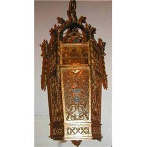 Heraldic Chandelier. Intricate metal work. Unusual painted design. A dramatic and elegant hall light.