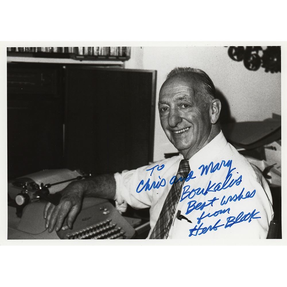American political cartoonist (1909–2001) best known for his commentaries on national domestic and foreign policy. Glossy 7 x 5 photo of Herblock at his typewriter, signed and inscribed in blue felt tip, "To Chris and Mary Boukalis, Best wishes from Herb Block.” In fine condition.