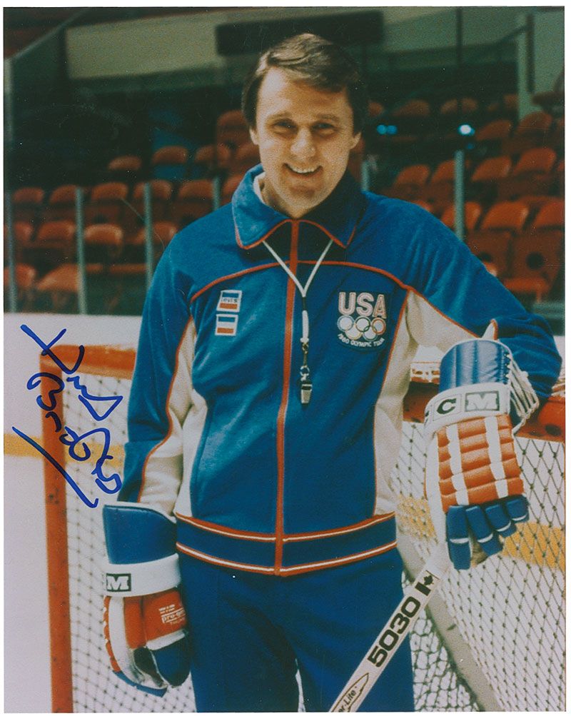 American ice hockey coach (1937-2003), best known for coaching the US hockey team to a gold medal at the 1980 Winter Olympics in an event known as the ‘Miracle on Ice.’ Color glossy 8 x 10 photo of Brooks posing on the ice during a Team USA practice, signed in blue felt tip. In fine condition.