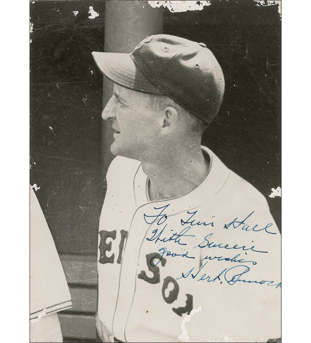 Hall of Fame pitcher who threw 35 shutouts. Rare vintage glossy 5.75 x 8 photo of Pennock from his time as a Red Sox coach, signed and inscribed in fountain pen “To Tim Hall, With sincere good wishes, Herb Pennock.” In good to very good condition, with trimmed edges, with right edge abutting on end of signature, scattered creases, surface marks, and impressions, and scattered surface loss, mainly to edges.