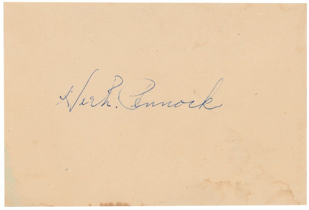 Hall of Fame pitcher who threw 35 shutouts. Terrific vintage fountain pen signature on an off-white 5 x 3.5 slip. A crease to the bottom left corner, light soiling along the bottom edge, and slightly irregular ink adhesion to a few letters of the signature, otherwise fine condition. Accompanied by the original mailing envelope, postmarked August 31, 1937.