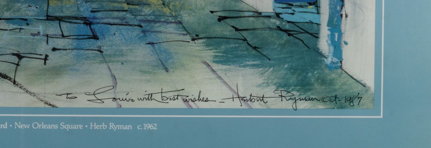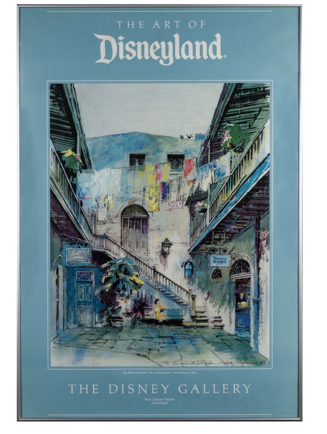 (Disneyland, 1987) A signed poster print of artwork by Herb Ryman titled “Royal Courtyard” depicting the Court of Angels in Disneyland’s New Orleans Square. The print has been inscribed, signed, and dated by the artist at lower right, “To Louie with best wishes. Herb Ryman 1987.” Measuring 38”x26”, the piece is presented in a 39.5”x27.5” silver metal frame. It is in fine condition, with minor frame wear.