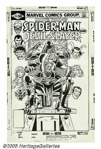 <B>Herb Trimpe and Frank Giacoia - Marvel Team-Up #111 Cover Original Art (Marvel, 1981).</B></I> <B>Marvel Team-Up</B></I> began 1972 and the title was Marvel's answer to DC's <B>The Brave and the Bold</B></I>, which had Batman paired with a different character each month. Marvel took their top star, Spider-Man, and featured the web-spinner in a similar team-up feature. In this cover from 1981, Rich Buckler and Frank Giacoia pit web-head and the Devil-Slayer against a demon of Cthuluian proportions, while members of the Defenders look on. The image area of the cover measures 10" x 15" and the art is in Excellent condition.