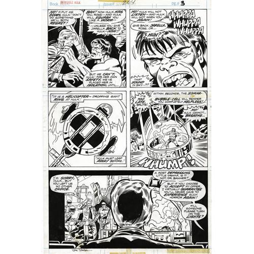 <B>Herb Trimpe and Joe Staton - The Incredible Hulk #204, page 3 (Marvel, 1976).</B></I> Bruce Banner watches footage of himself as the Jade Giant, in battle with General Ross, in this page from "Vicious Circle!," the last in a long line of Len Wein/Herb Trimpe tales. Penciled by Herb Trimpe, with inks by Joe Staton, this page has an image area of 10" x 15". There are tape stain in the upper and lower edges, and a small glue stain in the fourth panel; otherwise the condition is Very Good. Signed by Joe Staton at the bottom left.