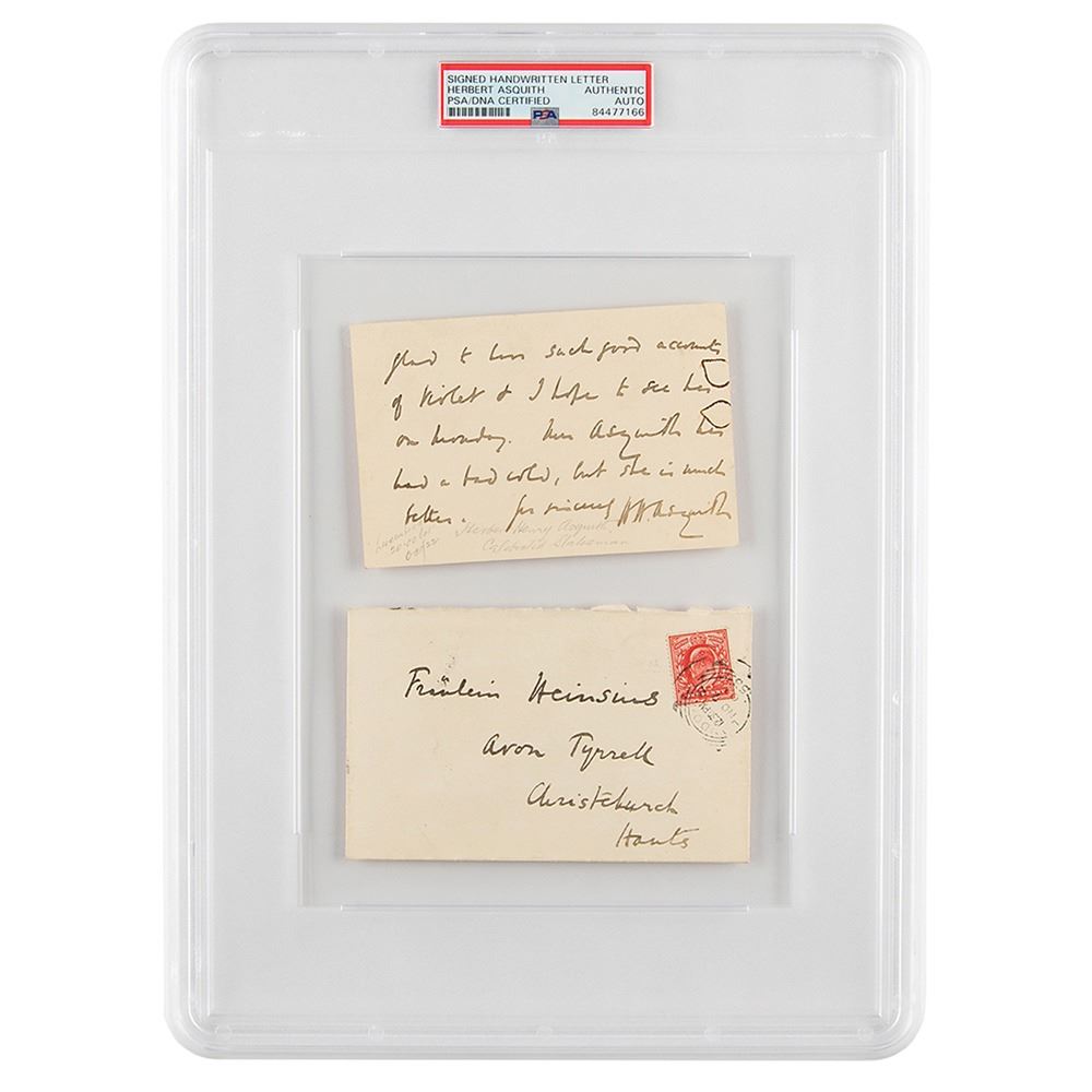 British statesman (1852-1928) who served as prime minister from 1908 to 1916. ALS signed & ldquo;H. H. Asquith,& rdquo; one page, 4.75 x 3, 20 Cavendish Square letterhead, November 7, 1902. Handwritten letter to "Fraulein Heinsins," referring to his daughter Violet. In part: "I enclose cheque for & pound;5. Thank you for your letter. We are very glad to have such good accounts of Violet & amp; I hope to see her on Monday. Mrs. Asquith has had a tad cold, but she is much better." In fine condition. Accompanied by the original mailing envelope, addressed in Asquith& #39;s hand. Encapsulated in a PSA/DNA authentication holder.