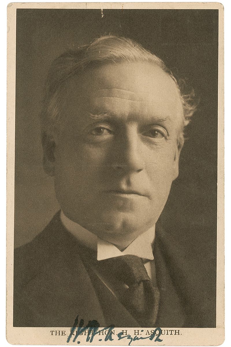 Served as British Prime Minister from 1908–1916. Vintage 3.5 x 5.5 postcard photo, signed in the lower border in black ink, “H. H. Asquith.” Some light feathering to signature, some light corner tip creases, and some scattered light surface marks, otherwise fine condition.