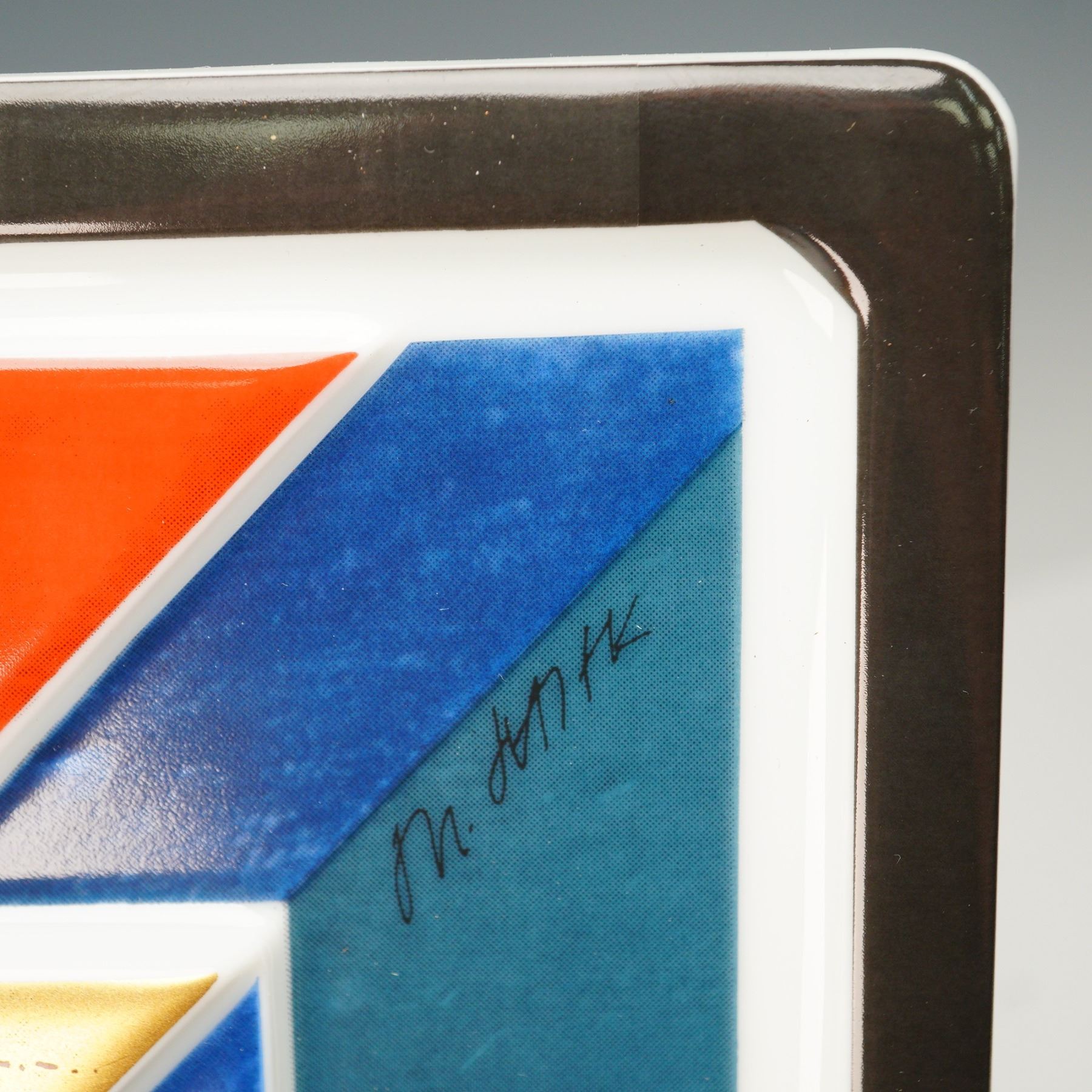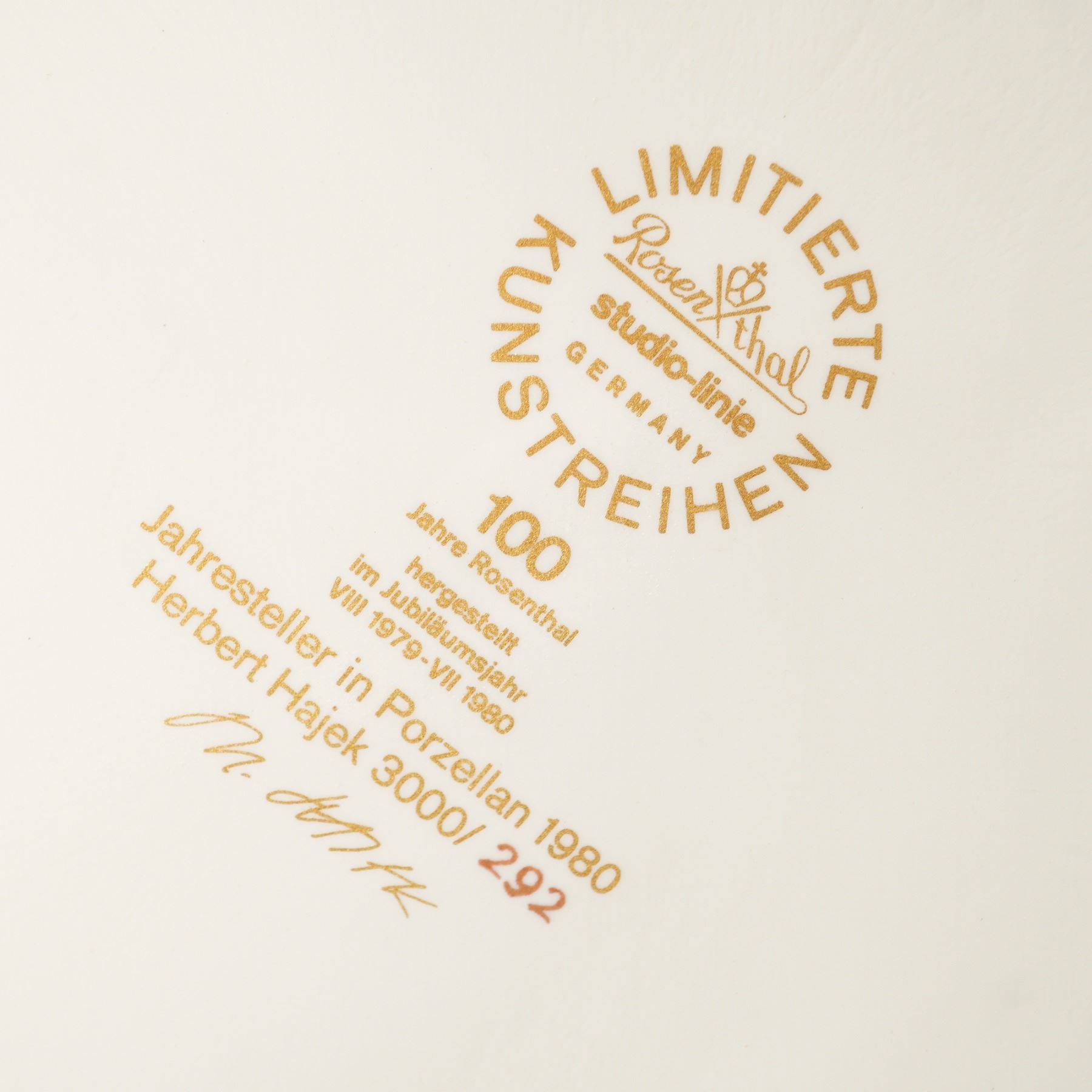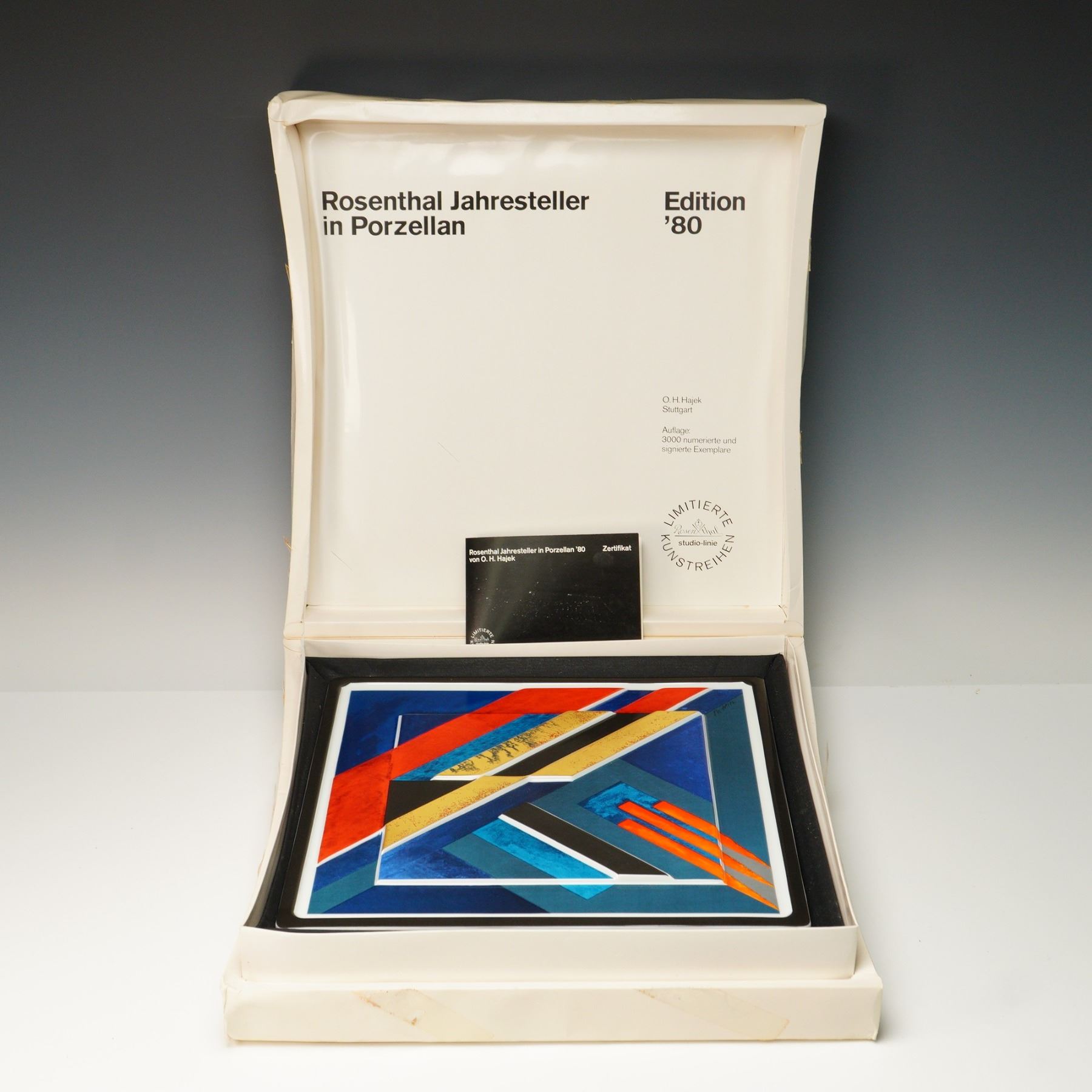 This striking Rosenthal Studio Line porcelain Jahresteller from 1980 showcases the bold abstract geometric artistry of Herbert Hajek. Designed in celebration of Rosenthal's centennial year, the plate features dynamic angular forms in vivid red, cobalt blue, teal, gold, and black, creating a powerful modernist composition. The backstamp identifies it as part of Rosenthal's limited Kunstreihen series, numbered 292/3000, and it is hand-signed by Hajek. The plate comes with its original presentation box and certificate of authenticity, making it an outstanding collectible from Rosenthal's prestigious Studio Line and a remarkable piece of late 20th-century design.