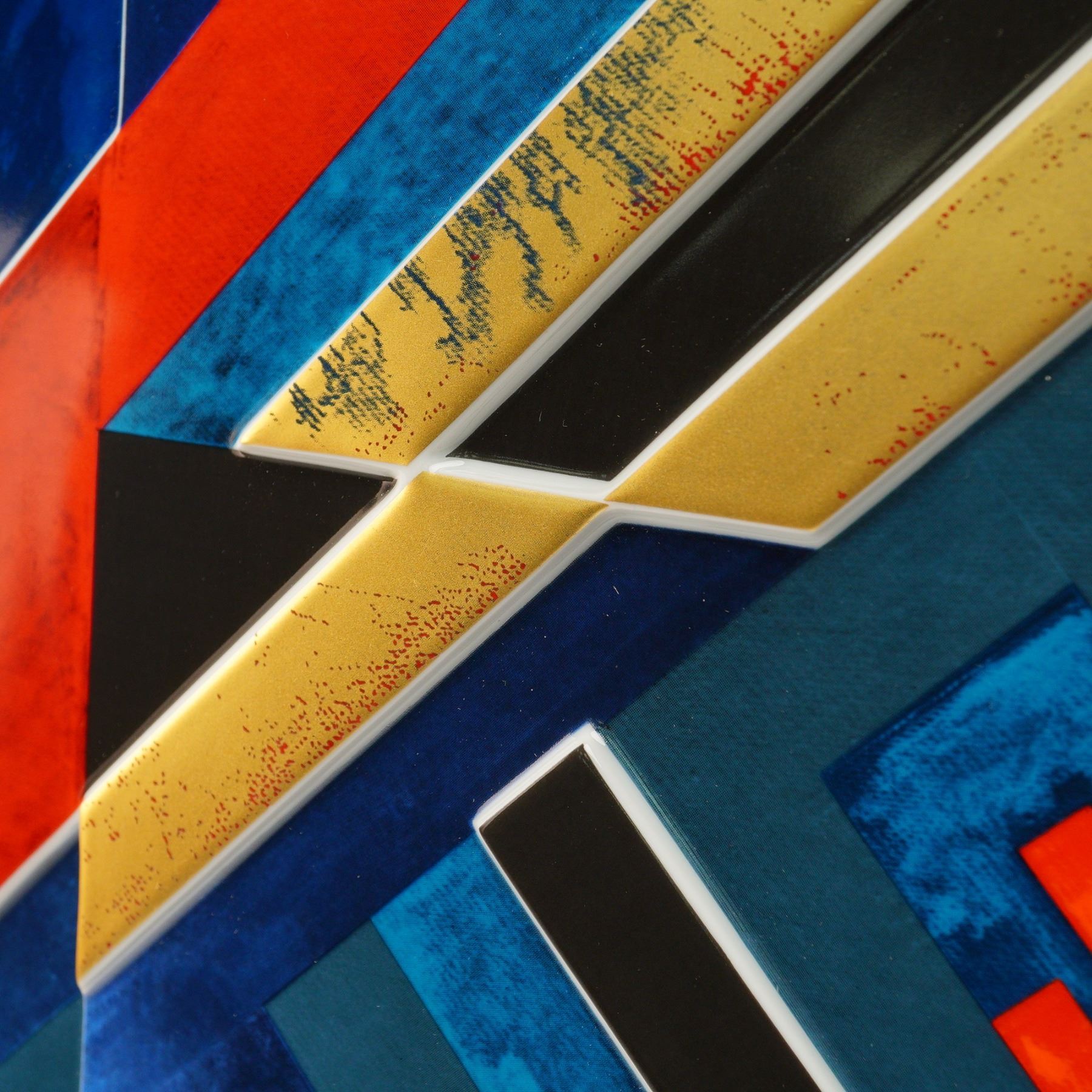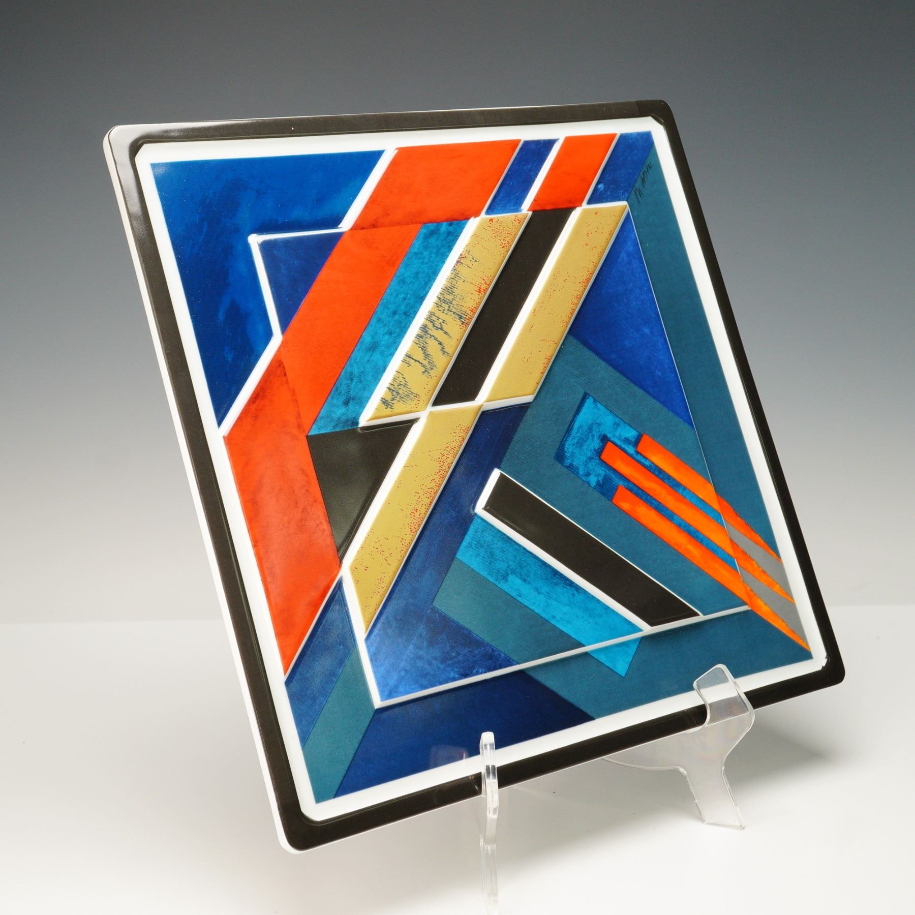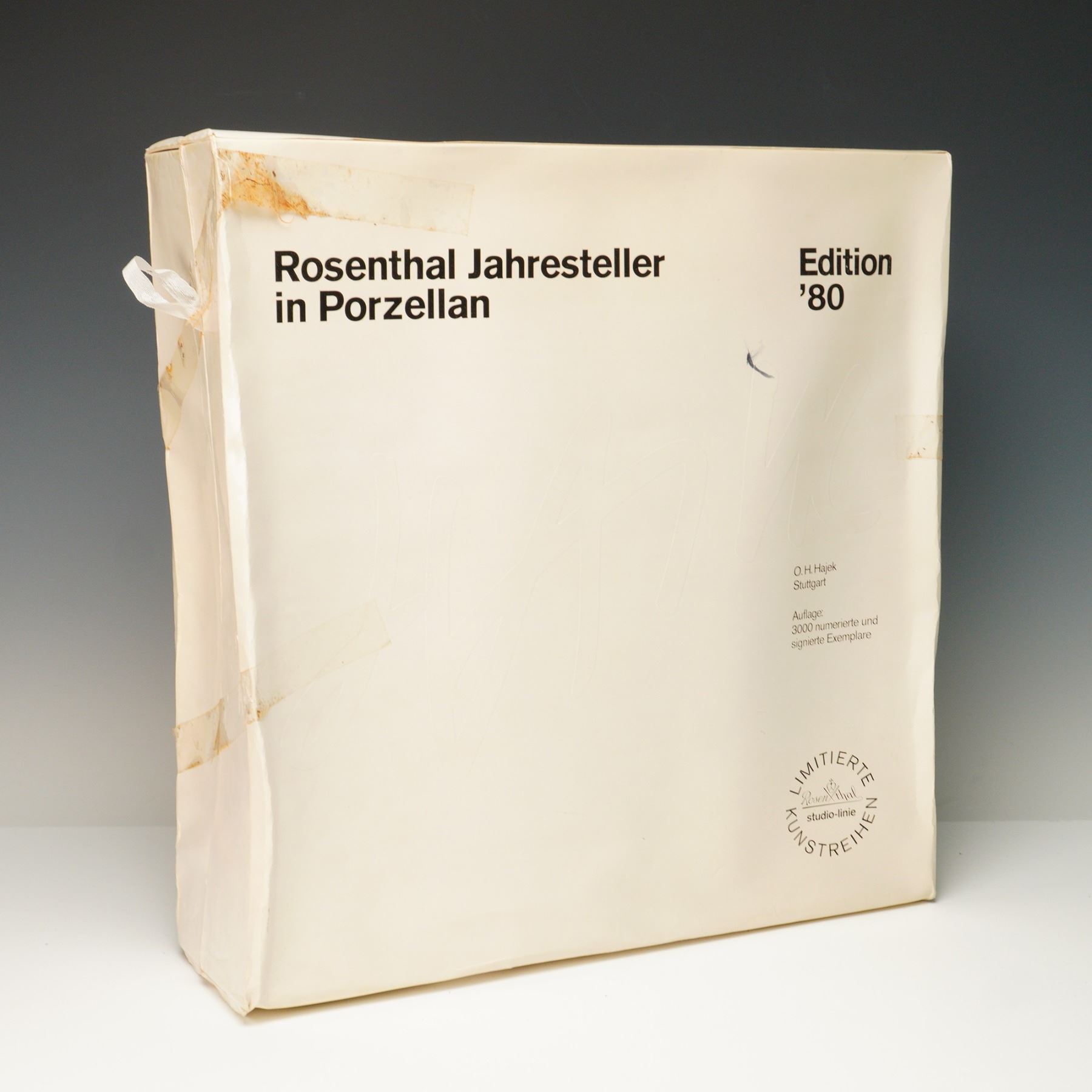 This striking Rosenthal Studio Line porcelain Jahresteller from 1980 showcases the bold abstract geometric artistry of Herbert Hajek. Designed in celebration of Rosenthal's centennial year, the plate features dynamic angular forms in vivid red, cobalt blue, teal, gold, and black, creating a powerful modernist composition. The backstamp identifies it as part of Rosenthal's limited Kunstreihen series, numbered 292/3000, and it is hand-signed by Hajek. The plate comes with its original presentation box and certificate of authenticity, making it an outstanding collectible from Rosenthal's prestigious Studio Line and a remarkable piece of late 20th-century design.
