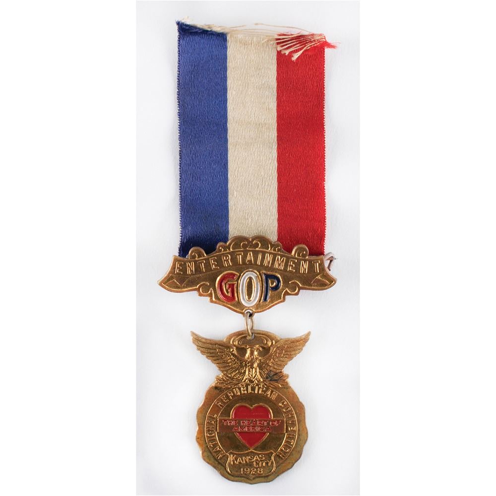 Attractive gold-tone enameled "Entertainment" badge from the 1928 Republication National Convention held in Kansas City from June 12 to June 15, 1928. The badge is attached to a tricolor ribbon, and reads: "Entertainment, GOP," with suspended medallion below, "National Republican Convention, The Heart of America, Kansas City, 1928." In fine condition. After President Coolidge had unexpectedly announced that he would not run for re-election in 1928, Commerce Secretary Herbert Hoover became the natural front-runner for the Republican nomination; at the Convention, he was nominated on the first ballot with 837 votes.