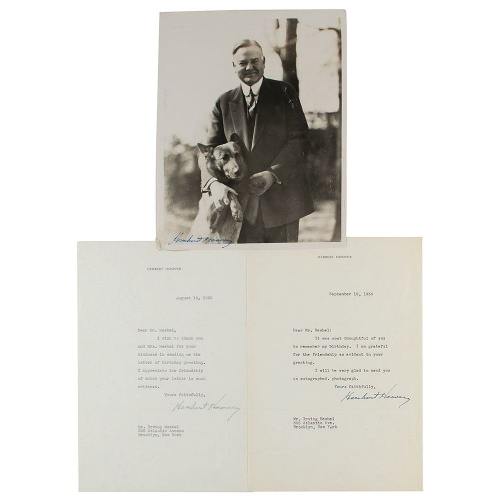 Three items, including two TLSs, both one page, personal letterhead, August 19, 1933 and September 19, 1934, addressed to Irving Meshel and sending thanks for his birthday wishes, with the latter also forwarding a glossy 7.75 x 9.75 “autographed photograph,†which is likewise included. In overall fine condition, with a tear to the lower left corner tip of the photo repaired with clear tape.