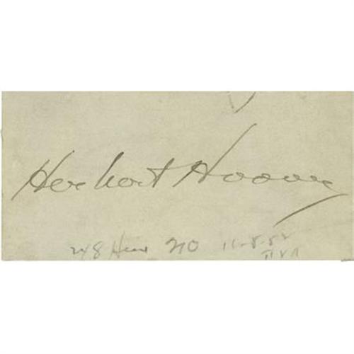 <B>Herbert Hoover Clipped Signature</B></I> “<I>Herbert Hoover</B></I>”. 3.25” x 1.5”, clipped from a larger document or letter, ink slightly faded and mounting remnants on verso, else very good. <I>Ex. Henry E. Luhrs Collection.</B></I> <BR><BR><b>Shipping:</b> Flat Material, Small (<a target="_blank" href="http://www.heritageauctions.com/common/shipping.php">view shipping information</a>)