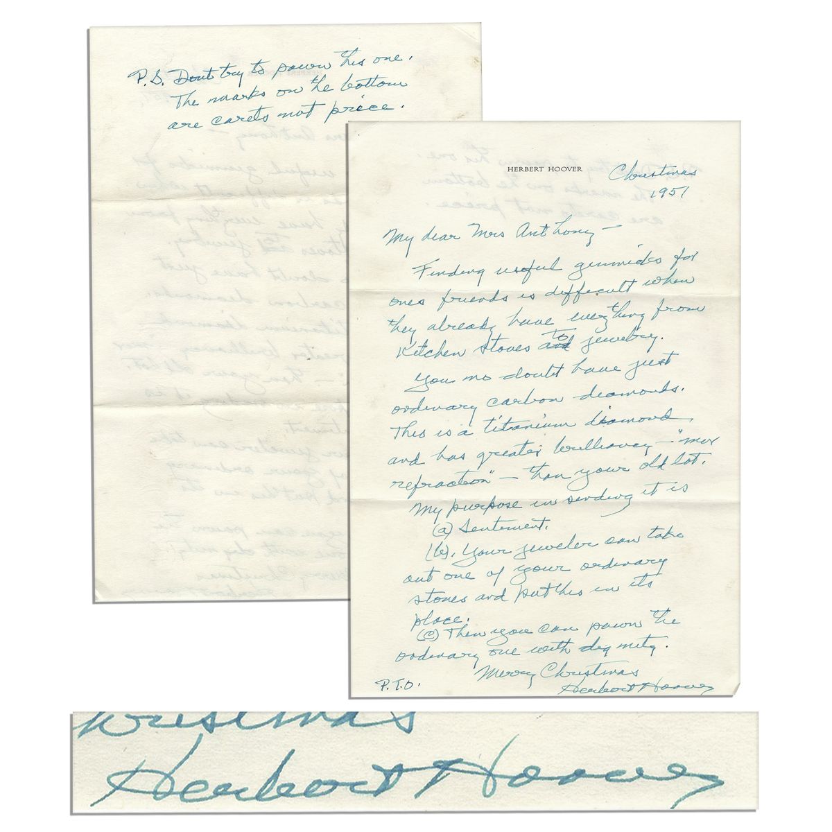 Herbert Hoover autograph letter signed, dated Christmas 1951 on his personal stationery. Addressed to Esther Anthony, wife of Edward Anthony, Hoover's publicity manager during his successful presidential campaign. Written in turquoise-colored ink, reads: ''My dear Mrs. Anthony -- Finding useful gimmicks for ones friends is difficult when they already have everything from kitchen stoves to jewelry. You no doubt have just ordinary carbon diamonds. This is a titanium diamond and has greater brilliance - 'more refraction' - than your old lot. My purpose in sending it is (a) Sentiment. (b) Your jeweler can take out one of your ordinary stones and put this in its place. (c) Then you can pawn the ordinary one with dignity. Merry Christmas / Herbert Hoover. P.T.O.'' With a postscript to verso, ''P.S. Don't try to pawn this one. The marks on the bottom are carets not price.'' 2pp. letter on a single sheet is signed on the first page with the postscript written to verso. Measures 7.25'' x 10.5''. Creasing. Near fine.