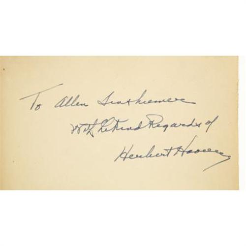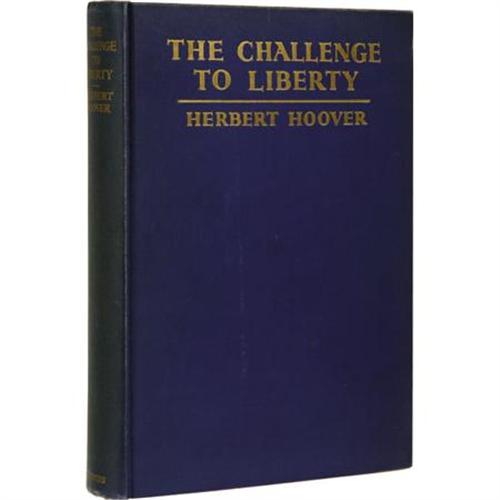 <B>Herbert Hoover: Inscribed and Signed First Edition of <I>The Challenge to Liberty</B></I>.</B></I> (New York: Charles Scribner's Sons, 1934), first edition, 212 pages, blue cloth with gilt lettering on the spine and front board, 8vo (5.5" x 8"), no dust jacket, protective Mylar sleeve over boards. Inscribed and signed "<I>To Allen Sinsheimer With the Kind Regards of Herbert Hoover</B></I>" on the front free endpaper. Housed in a custom quarter leather slipcase with floral decorative boards, gilt spine titles, and five raised leather spine bands. The book is in very good condition, with moderate shelf wear present. The textblock is clean and the binding is tight on this wonderful signed Hoover book.<BR><BR><b>Shipping:</b> Books & Catalogs (<a target="_blank" href="http://www.heritageauctions.com/common/shipping.php">view shipping information</a>)
