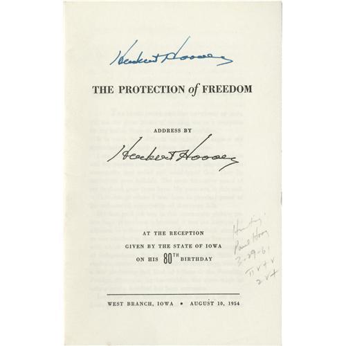 <B>Herbert Hoover Printed Speech Signed.</B></I> Signed, in turquoise ink, on the cover of his speech entitled "<I>The Protection of Freedom</B></I>", delivered at the reception given by the State of Iowa on the occasion of the 31st President's 80th birthday. 5" x 8", 19 pages, West Branch Iowa, August 10, 1954. In Very Fine condition, albeit there is, in faint pencil, a note in the lower right corner. A beautiful souvenir of a reflective, and cautionary, Cold War address. From the Henry E. Luhrs Collection. Accompanied by LOA from PSA/DNA.