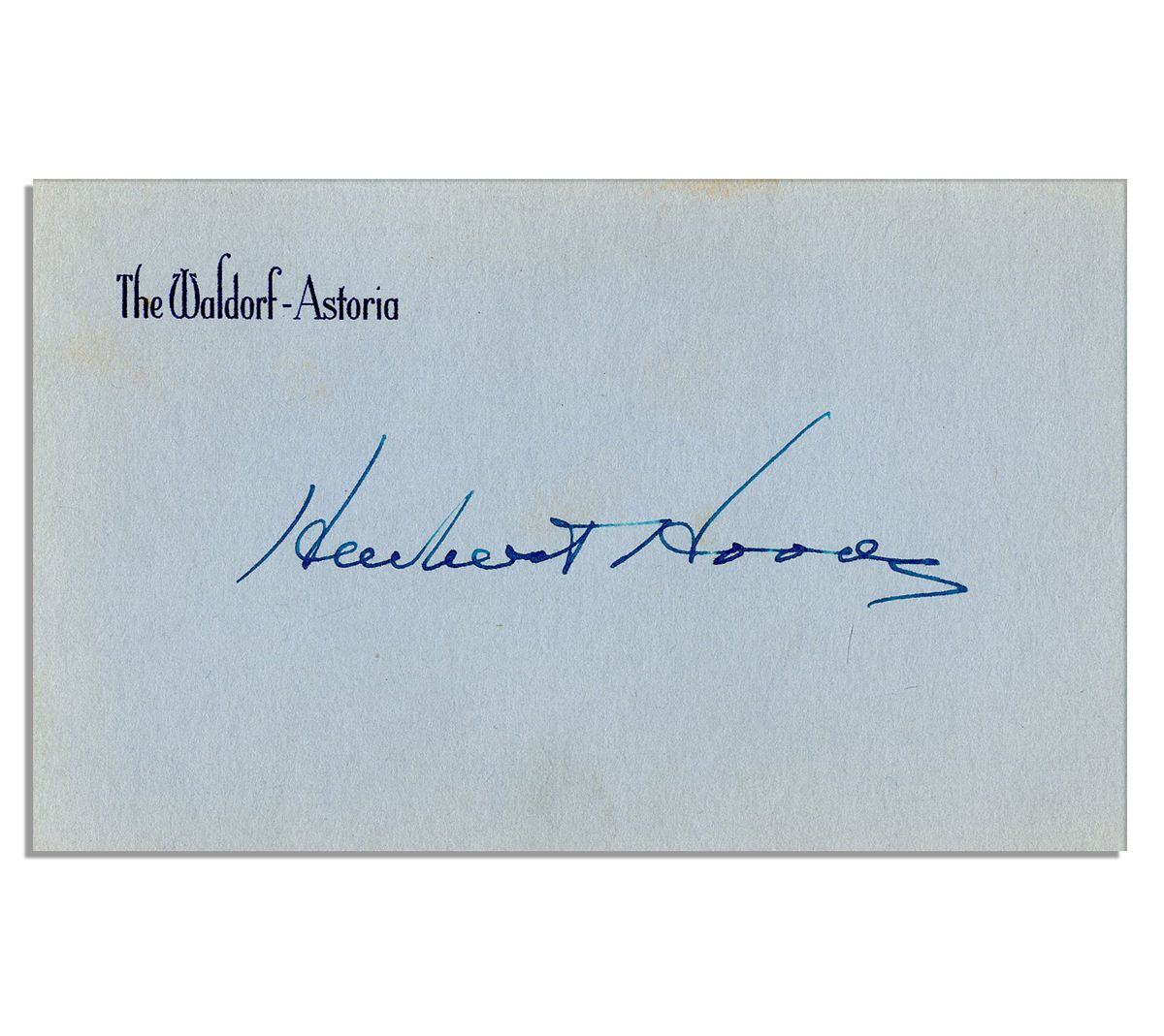 Herbert Hoover signature on blue Waldorf Astoria card-style stationery. Signed ''Herbert Hoover'' in blue ink. Measures 5.25'' x 3.25''. Light toning, else near fine condition.