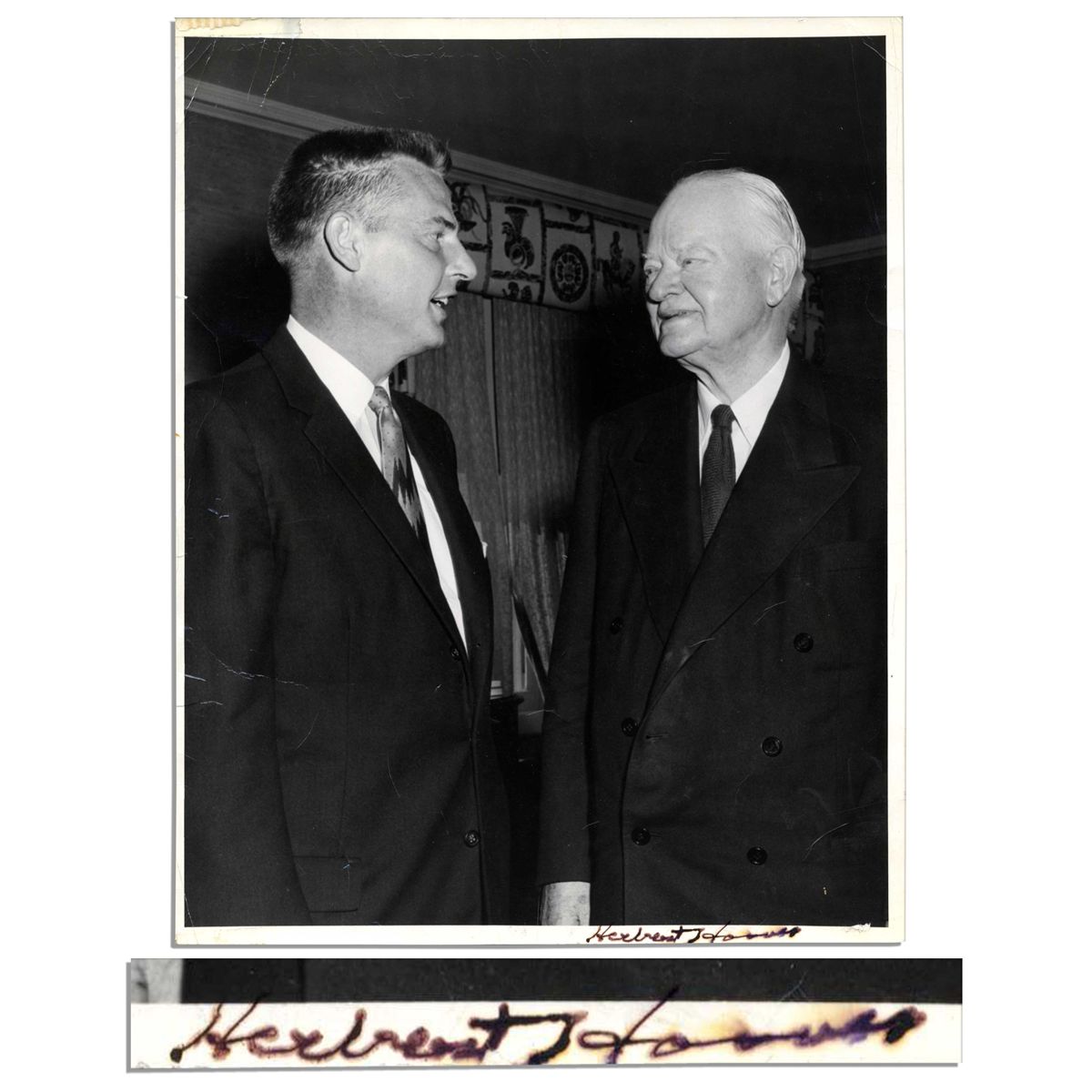 Herbert Hoover photo signed ''Herbert Hoover'' in black ink at the bottom edge. Hoover is pictured here in his later years, chatting with an unidentified man. 8'' x 10'' glossy photo shows light creasing, tape residue to upper left and some dampstaining to signature. Very good condition.