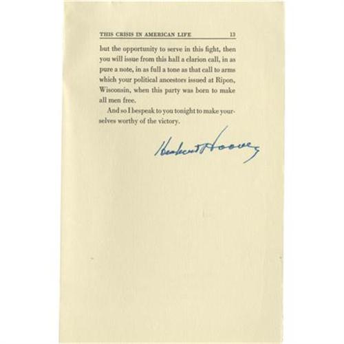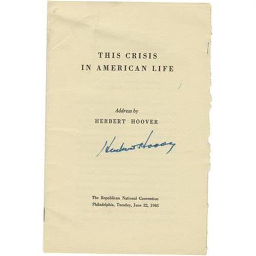 <B>President Herbert Hoover Signed Copy of "<I>This Crisis in American Life</B></I>",</B></I> the address given by Hoover at the Republican National Convention in Philadelphia on June 22, 1948, 16 pages, 5.5" x 8". Pamphlet is signed both on the cover and on the final page in fountain pen, with light feathering to ink. Pamphlet has negligible soiling to cover and two small stray ink marks. Lot also includes a "<I>Herbert Hoover</B></I>" signature on an oblong Waldorf Astoria imprinted note sheet, 5.25" x 3.25", and a printed photo of Hoover cut from a magazine. <I>From the collection of Henry E. Luhrs</B></I><BR><BR><b>Shipping:</b> Flat Material, Small (<a target="_blank" href="http://www.heritageauctions.com/common/shipping.php">view shipping information</a>)