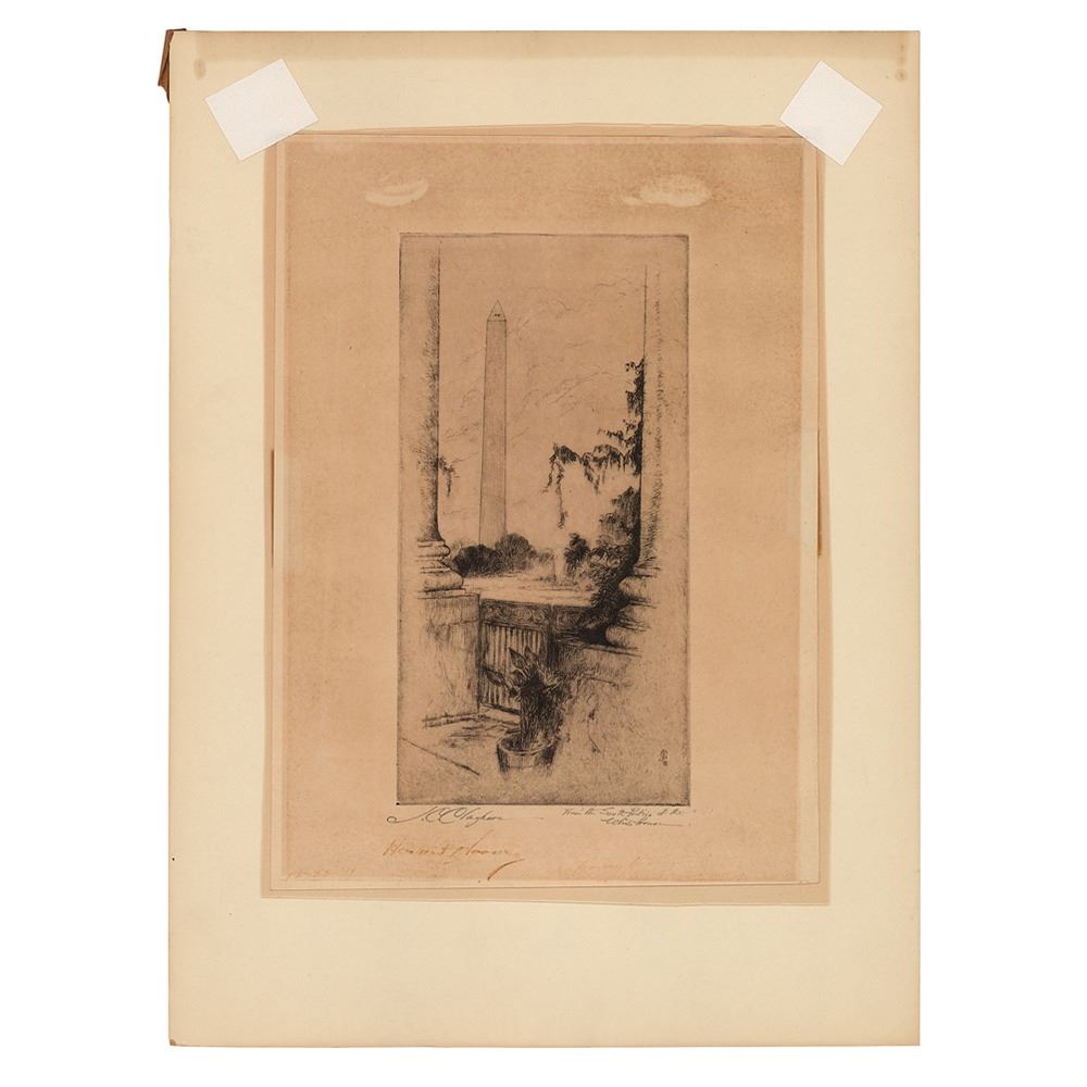 Attractive etching by artist Joseph C. Claghorn entitled ‘From the South Portico of the White House,’ which shows a view overlooking the south lawn and the nearby Washington Monument, signed below in fountain pen by Herbert Hoover. The etching is also signed by the artist, “J. C. Claghorn,” and is tape-affixed to a 10.25 x 14 cardstock mount. In very good to fine condition, with fading to the signature, toning from prior display, and tape to the upper corners.